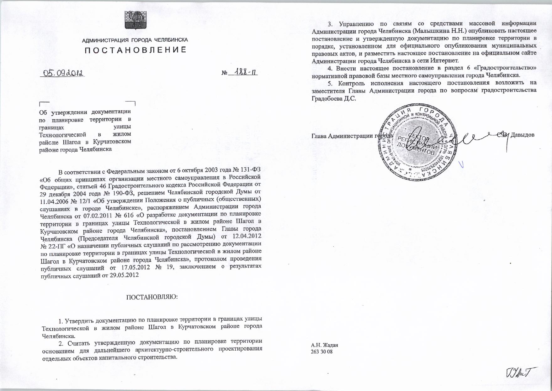 Постановление об утверждении документации по планировке территории в границах улицы Технологической в жилом районе Шагол в Курчатовской районе города Челябинска.