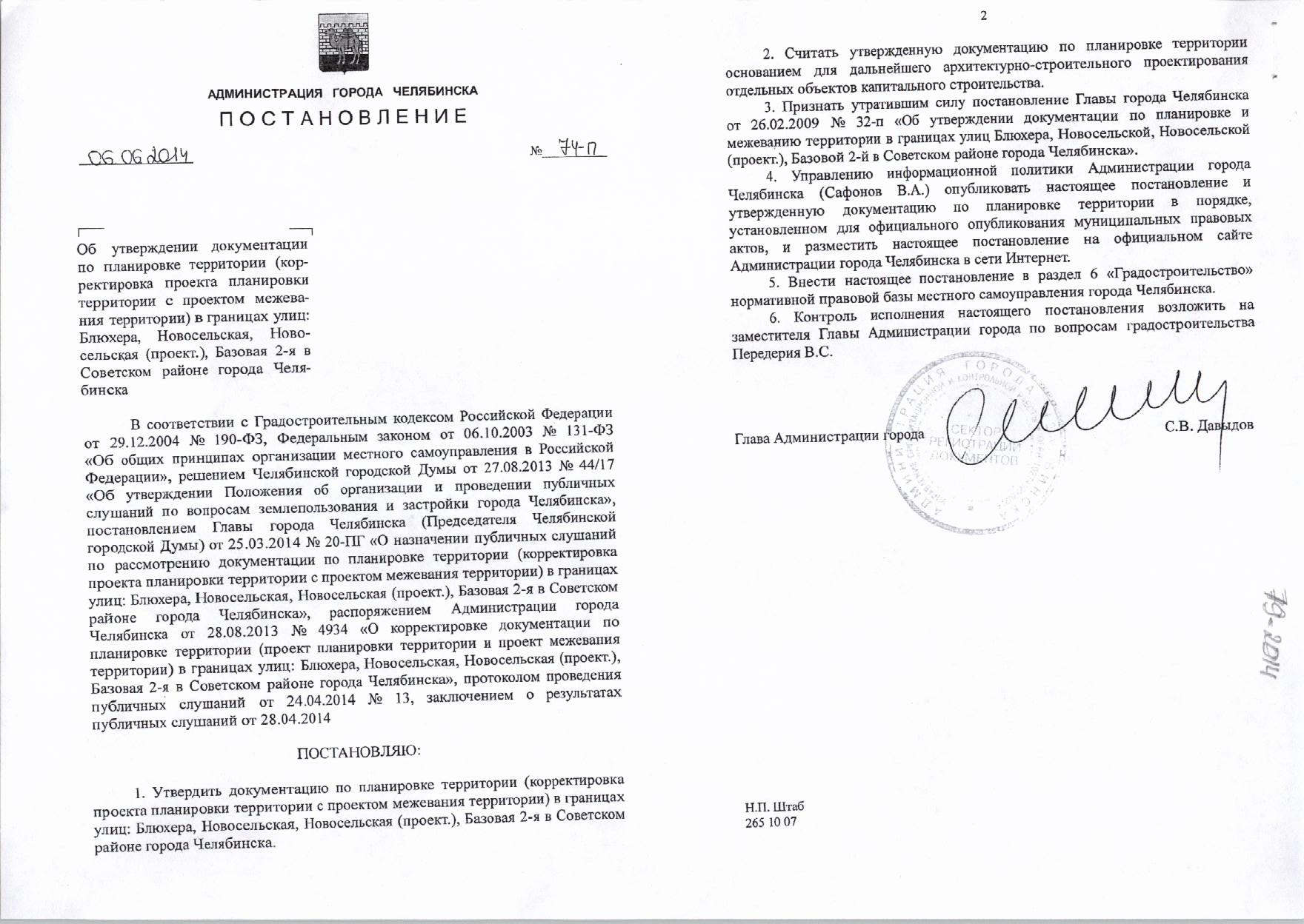 Постановление Главы города № 74-П от 06.06.2014 «Об утверждении документации по планировке территории в границах: ул.Блюхера, Новосельская, Базовая 2-я в Советском районе города Челябинска»