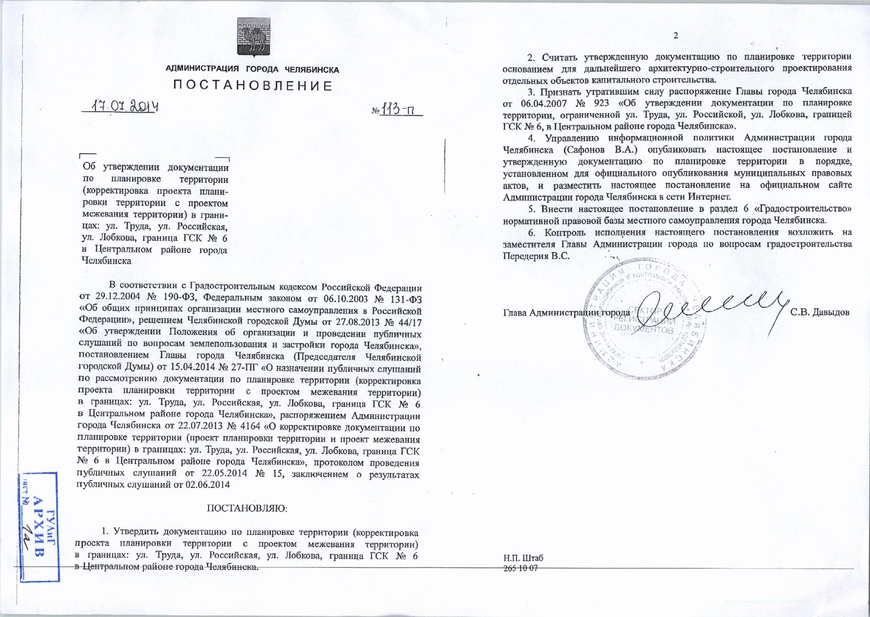Постановление Главы города № 113-П от 17.07.2014 «Об утверждении документации по планировке территории в границах: ул.Труда, Российская, Лобкова, ГСК №6 в Центральном районе города Челябинска»