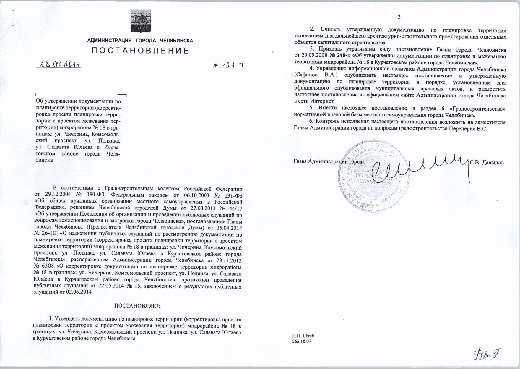 Постановление Главы города № 121-П от 28.07.2014 «Об утверждении документации по планировке территории микрорайона №18 в границах: ул.Чичерина, Комсомольский проспект, ул. Полянка, Салавата Юлаева в Курчатовском районе города Челябинска»