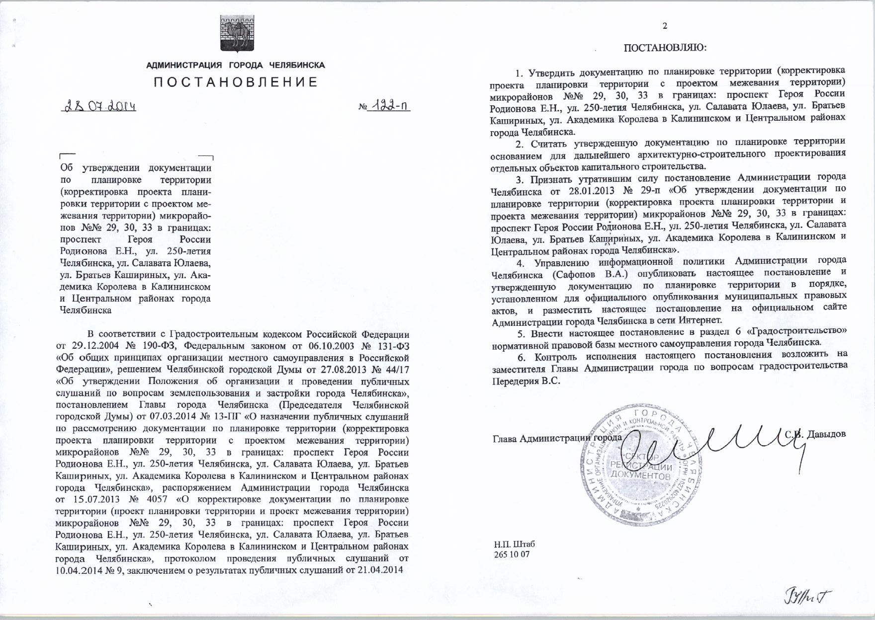 Постановление Главы города № 122-П от 28.07.2014 «Об утверждении документации по планировке территории микрорайонов №29, 30, 33 в границах: проспект Героя России Родионова Е.Н., ул. 250-летия Челябинска, Салавата Юлаева, Братьев Кашириных, Академика Королева в Калининском и Центральном районах города Челябинска»