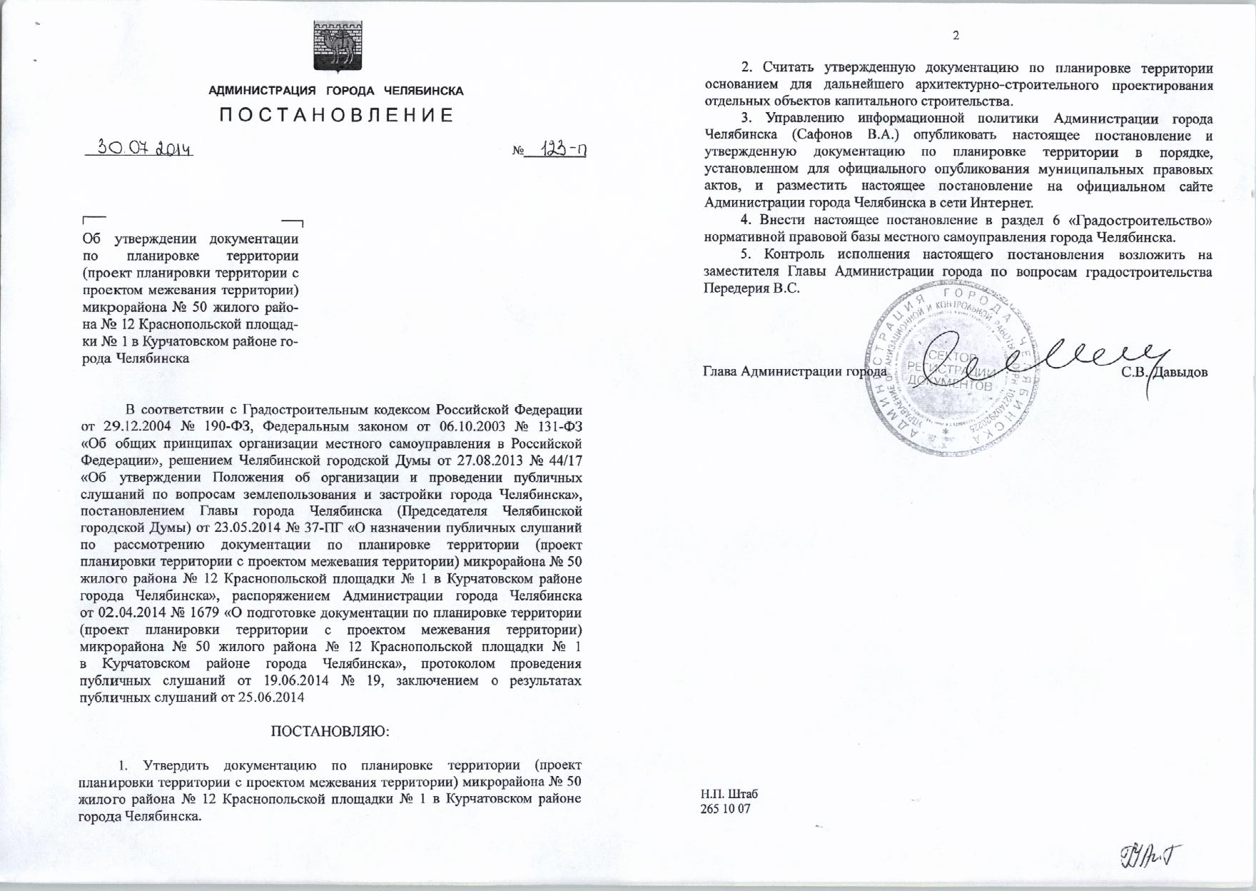 Постановление Главы города № 123-П от 30.07.2014 «Об утверждении документации по планировке территории микрорайона №50 жилого района №12 Краснопольской площадки №1 в Курчатовском районе города Челябинска»