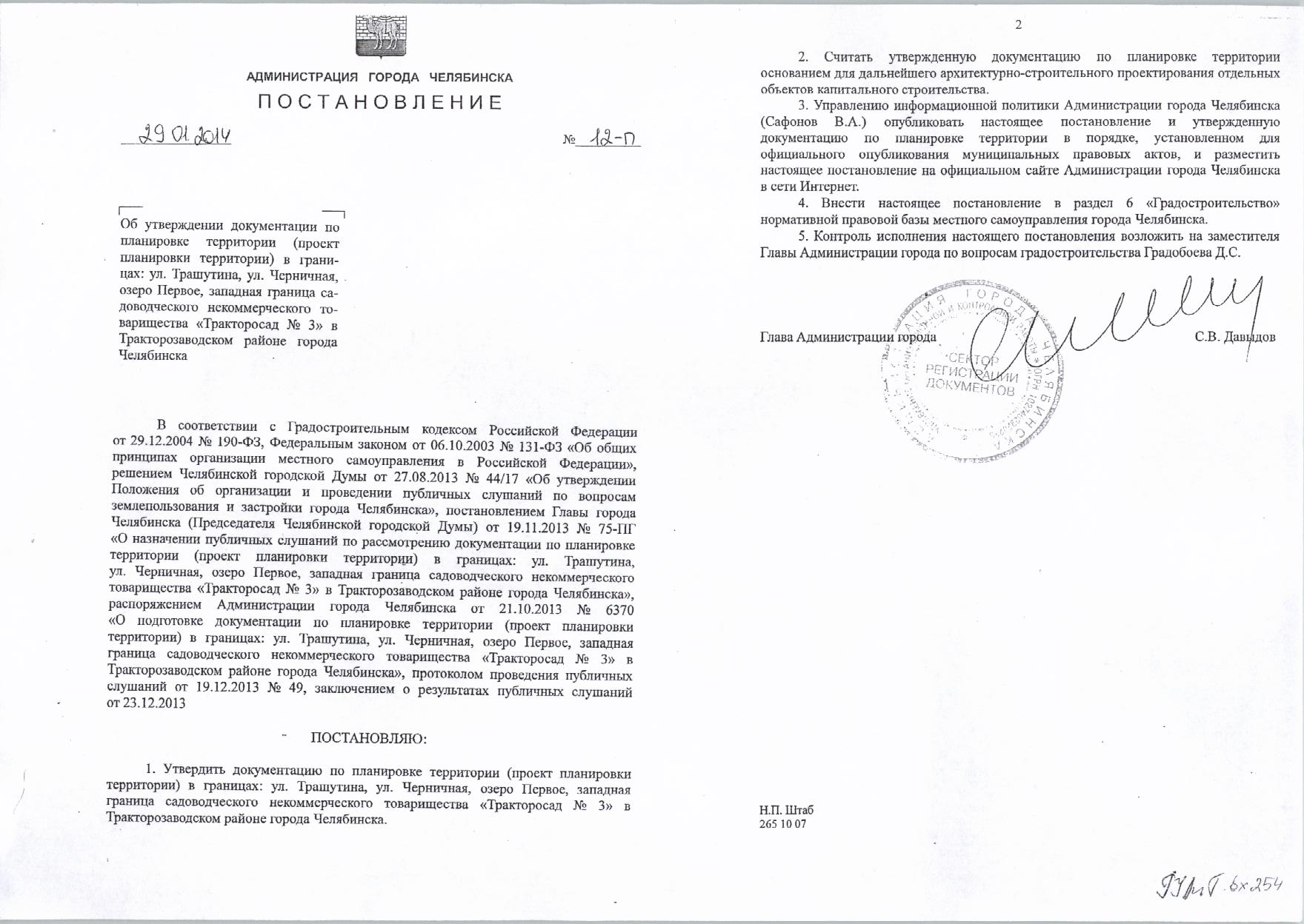 Постановление от 29.01.2014г №12-п «Об утверждении документации по планировке территории в границах: ул. Трашутина, ул. Черничная, озеро Первое, западная граница садоводческого некоммерческого товарищества «Тракторосад №3» в Тракторозаводском районе города Челябинска»