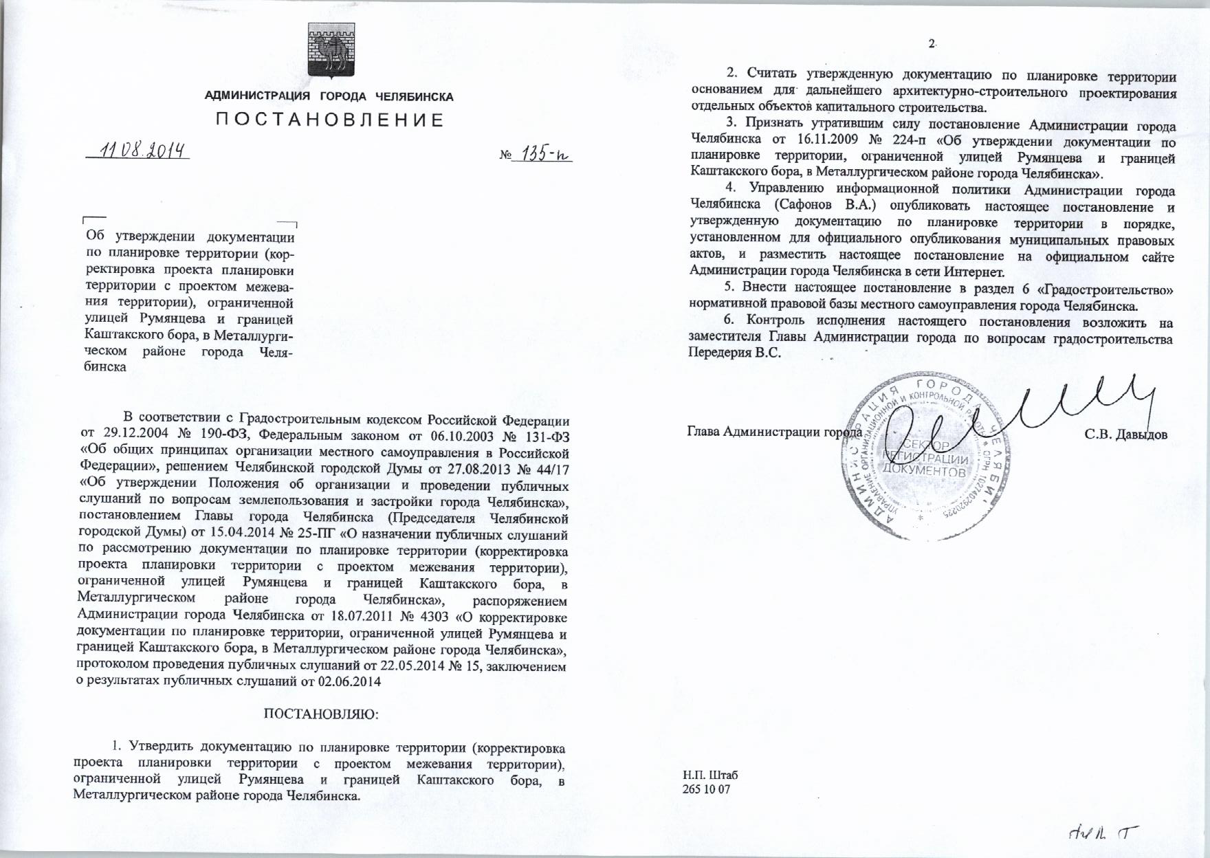 Постановление Главы города № 135-П от 11.08.2014 «Об утверждении документации по планировке территории в границах: ул.Блюхера, Новосельская, Базовая 2-я в Советском районе города Челябинска»
