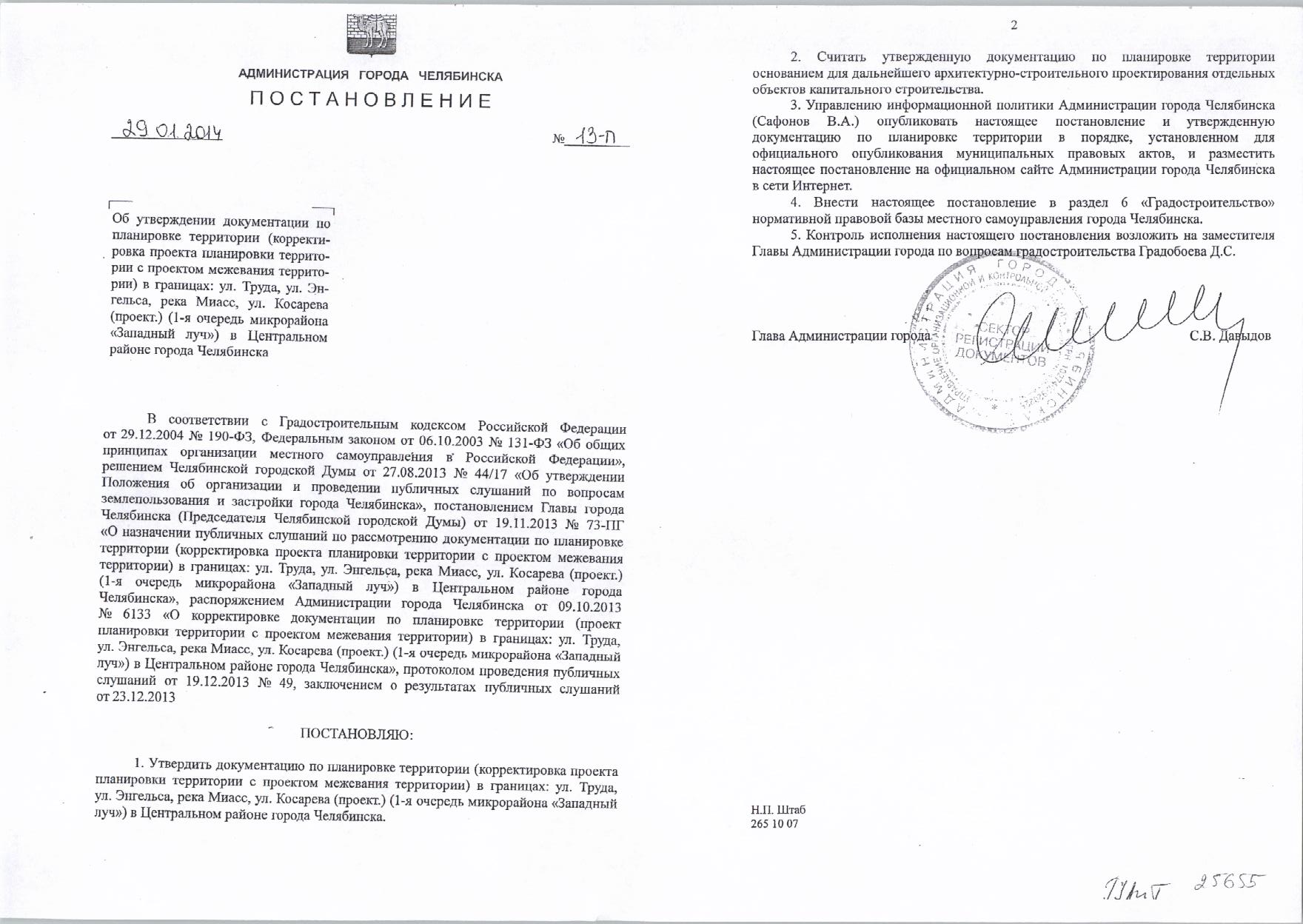 Постановление от 24.01.2014 №13-п «Об утверждении документации по планировке территории в границах: ул.Труда,ул.Энгельса,река Миасс,ул.Косарева (проект.)(1-я очередь микрорайона «Западный луч») в Центральном районе города Челябинска»