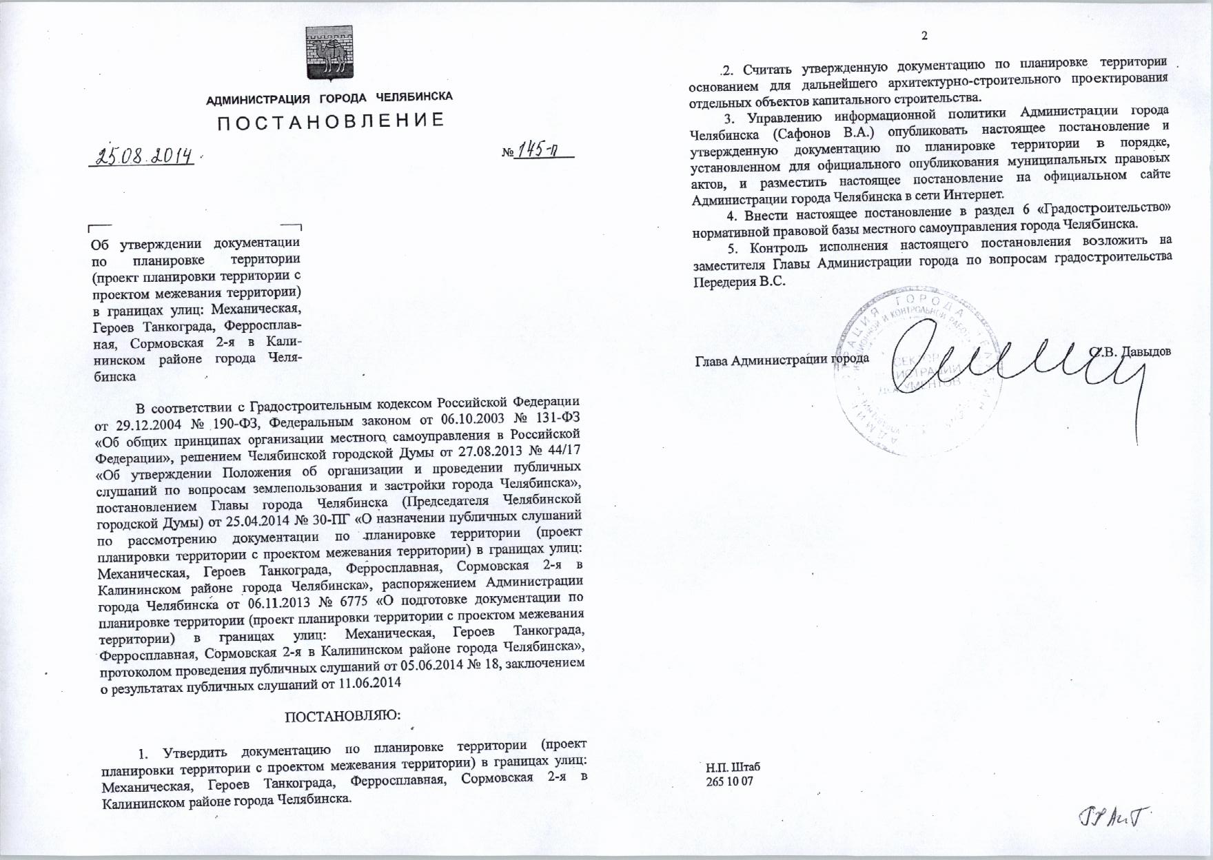 Постановление Главы города № 145-П от 25.08.2014 «Об утверждении документации по планировке территории в границах: ул.Механическая, Героев Танкограда, Ферросплавная, Сормовская 2-ая в Калининском районе города Челябинска»