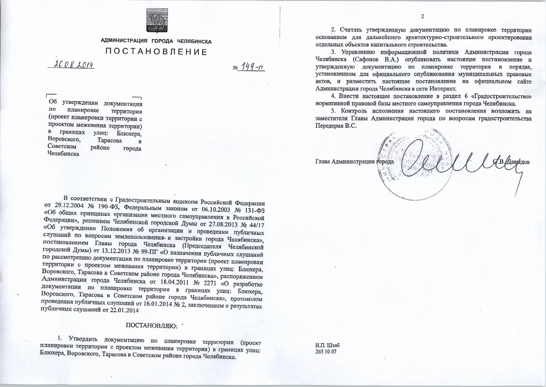 Постановление от 26.08.2014г №149-п «Об утверждении документации по планировке территории в границах: ул.Блюхера, Воровского, Тарасова в Советском районе города Челябинска»