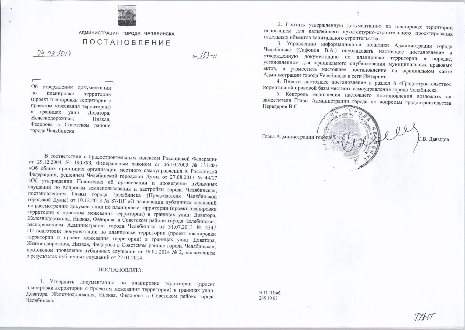 Постановление от 04.09.2014г №153-п «Об утверждении документации по планировке территории в границах: ул. Доватора, Железнодорожная, Низкая, Федорова в Советском районе города Челябинска»