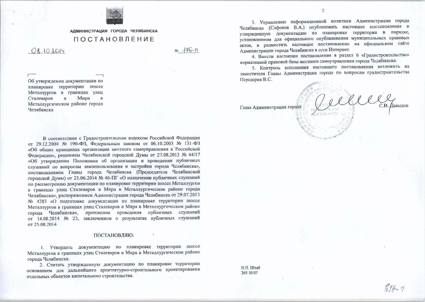 Постановление Главы города № 176-П от 08.10.2014 «Об утверждении документации по планировке территории шоссе Металлургов в границах: ул.Сталеваров, Мира в Металлургическом районе города Челябинска»