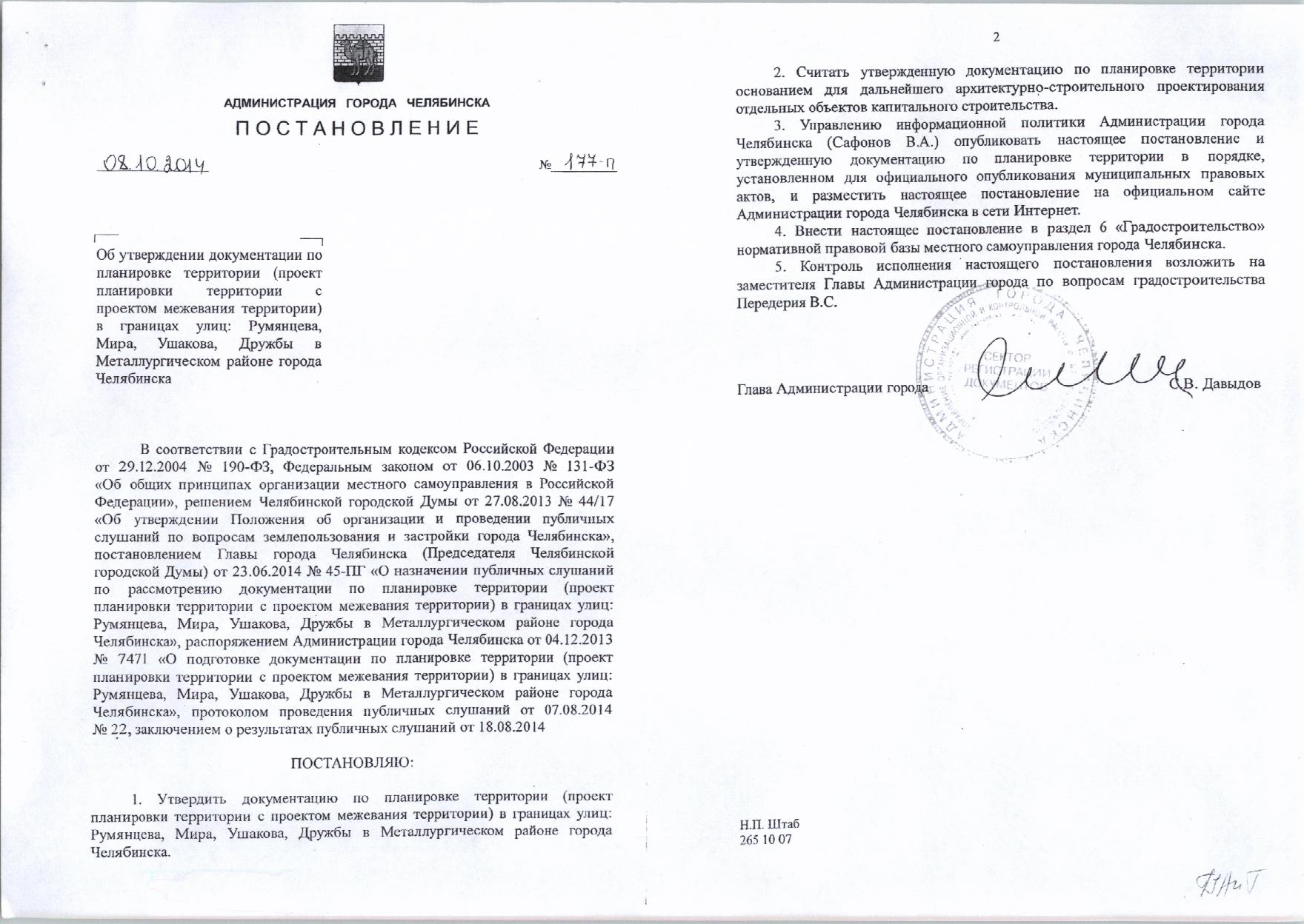 Постановление Главы города № 177-П от 08.10.2014 «Об утверждении документации по планировке территории,ограниченной улицей Румянцева и Каштакского бора в Металлургическом районе города Челябинска»