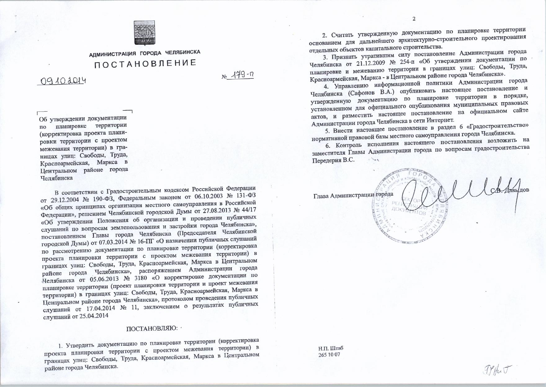 Постановление Главы города № 179-П от 09.10.2014 «Об утверждении документации по планировке территории в границах: ул.Свободы, Труда, Красноармейская, Маркса в Центральном районе города Челябинска»
