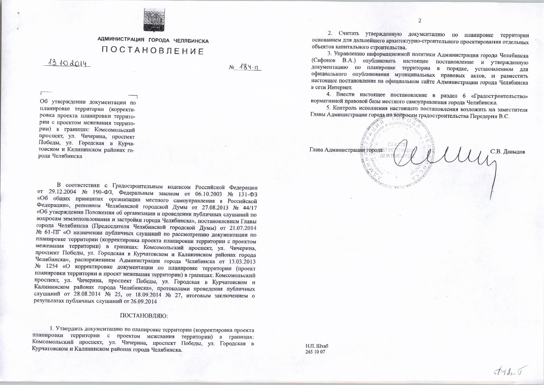Постановление Главы города № 184-П от 13.10.2014 «Об утверждении документации по планировке территории в границах: Комсомольский проспект, ул. Чичерина, Проспект Победы, ул. Городская в Курчатовском и Калининском районах города Челябинска»