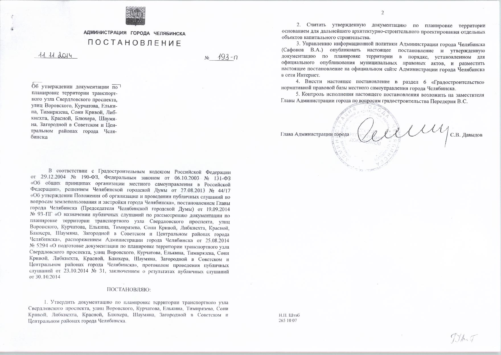 Постановление Главы города № 193-П от 11.11.2014 «Об утверждении документации по планировке территории транспортного узла Свердловского проспекта, улиц Воровского, Курчатова, Елькина, Тимирязева, Сони Кривой, Либнехта, Красной, Блюхера, Шаумяна, Загородной в Советском и Центральном районах города Челябинска»