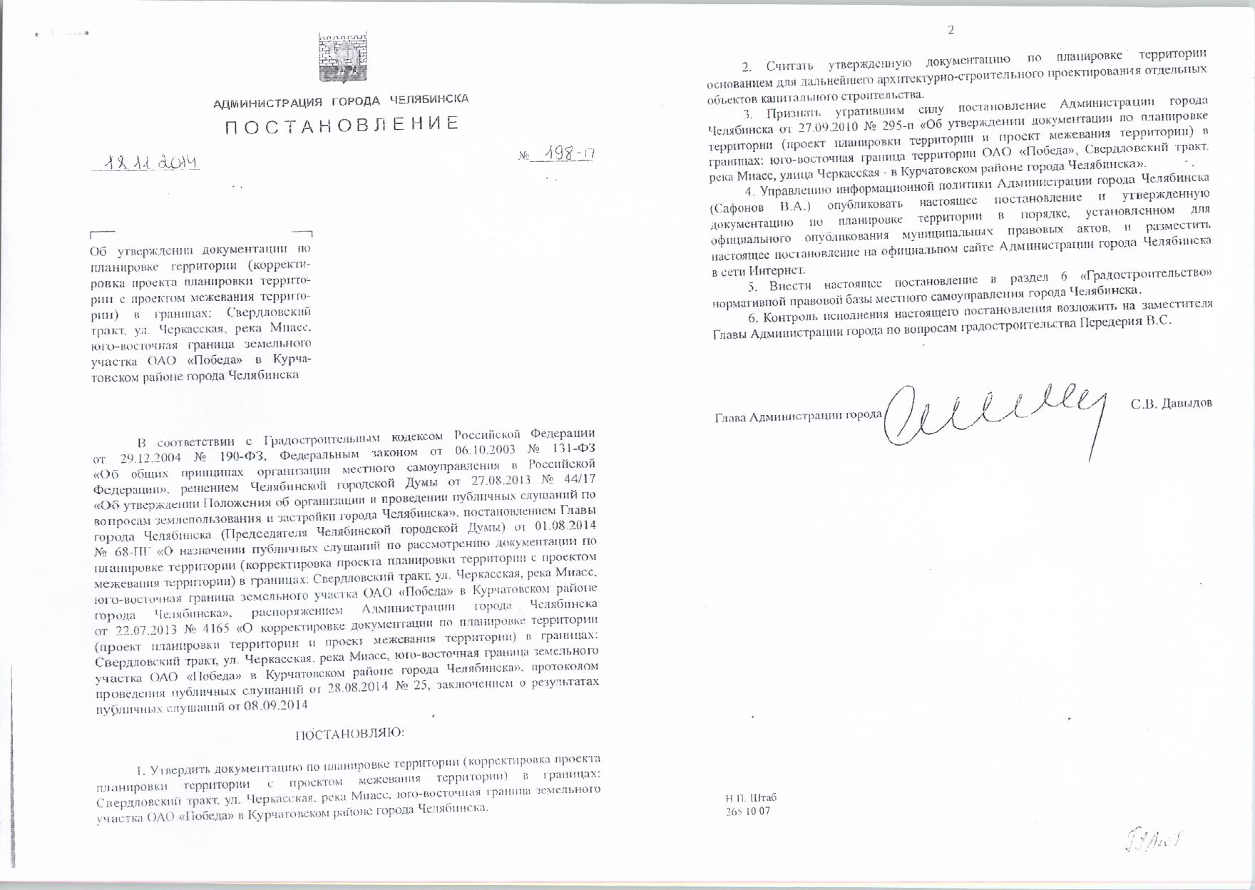 Постановление Главы города № 198-П от 18.11.2014 «Об утверждении документации по планировке территории в границах: Свердловский тракт, ул.Черкасская, река Миасс, юго-восточная граница земельного участка ОАО "Победа" в Курчатовском районе города Челябинска»