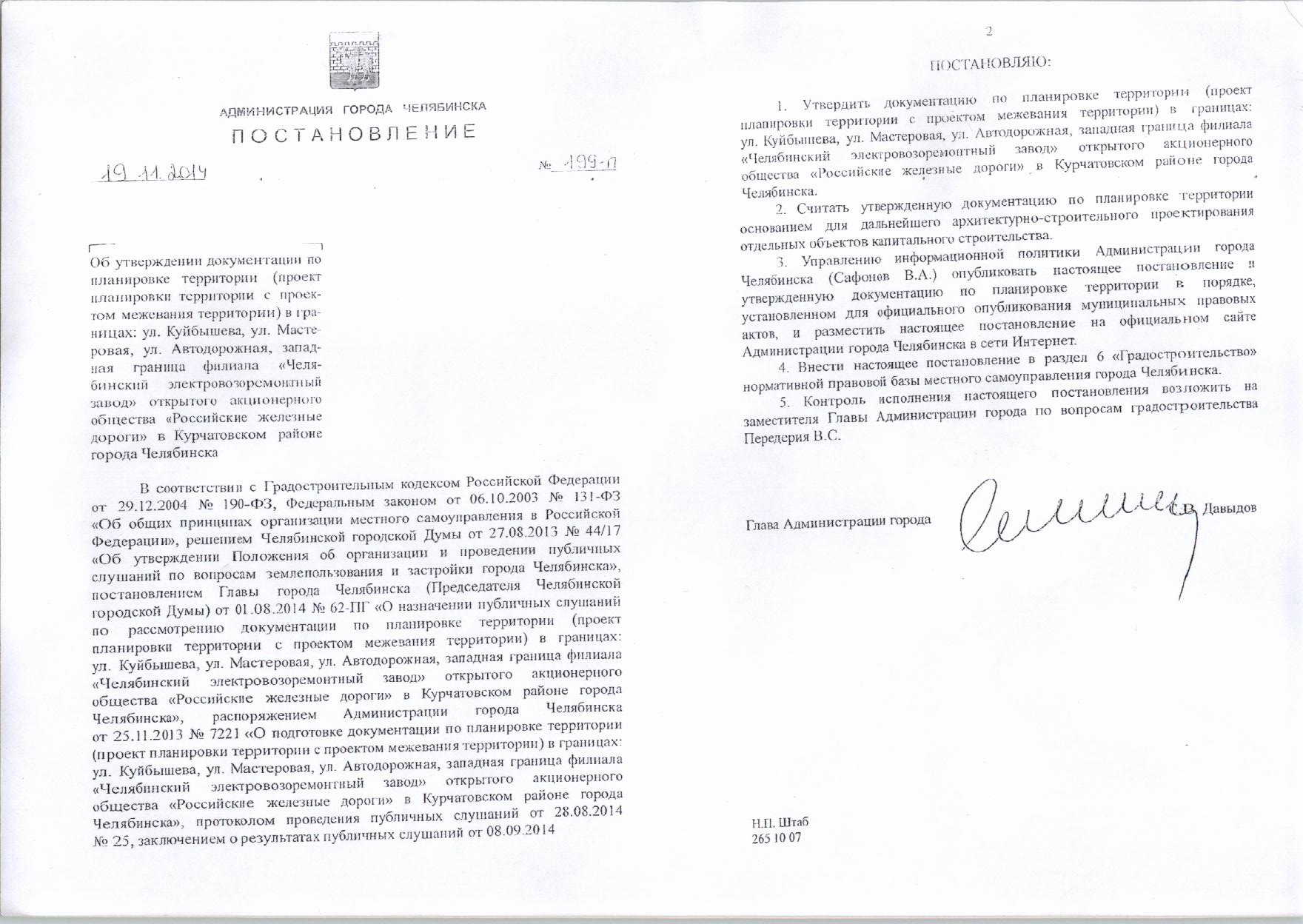 Постановление Главы города № 199-П от 19.11.2014 «Об утверждении документации по планировке территории в границах: ул.Куйбышева, Мастеровая, Автодорожная, западная граница филиала "Челябинский электровозоремонтный завод" открытого акционерного общества "Российские железные дороги" в Курчатовском районе города Челябинска»