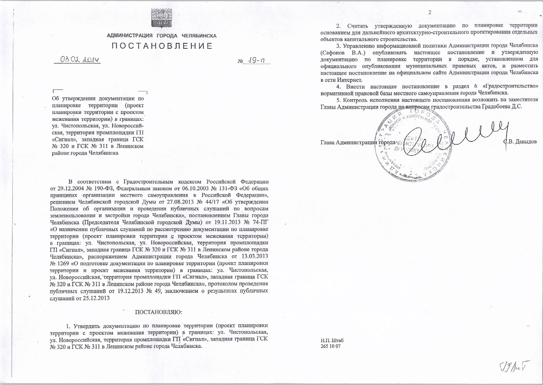 Постановление от 03.02.2014г №19-п «Об утверждении документации по планировке территории в границах: ул. Чистопольская, ул. Новороссийская, территория промплощадки ГП «Сигнал», западная граница ГСК №320 и ГСК №311 в Ленинском районе города Челябинска»