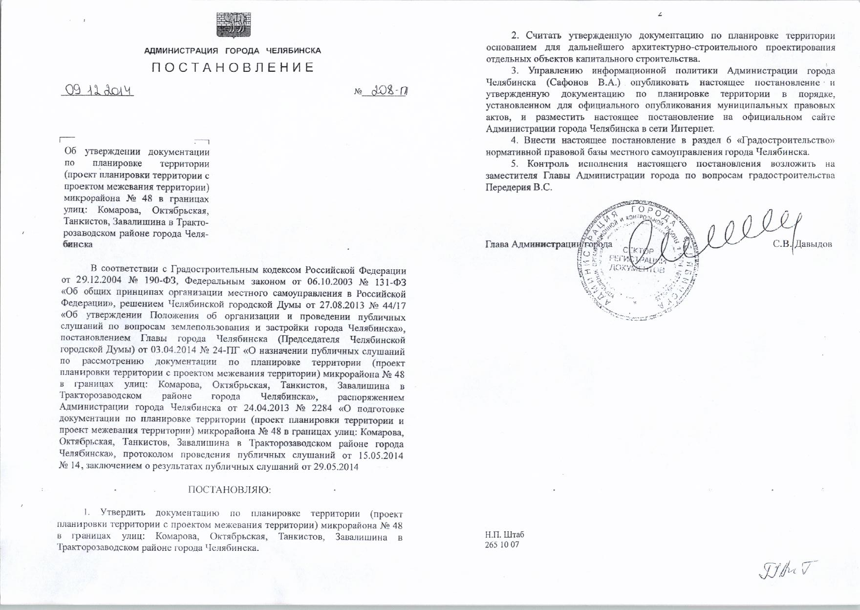 Постановление Главы города № 208-П от 09.12.2014 «Об утверждении документации по планировке территории микрорайона №48 в границах: ул.Комарова, Октябрьская, Танкистов, Завалишина в Тракторозаводском районе города Челябинска»