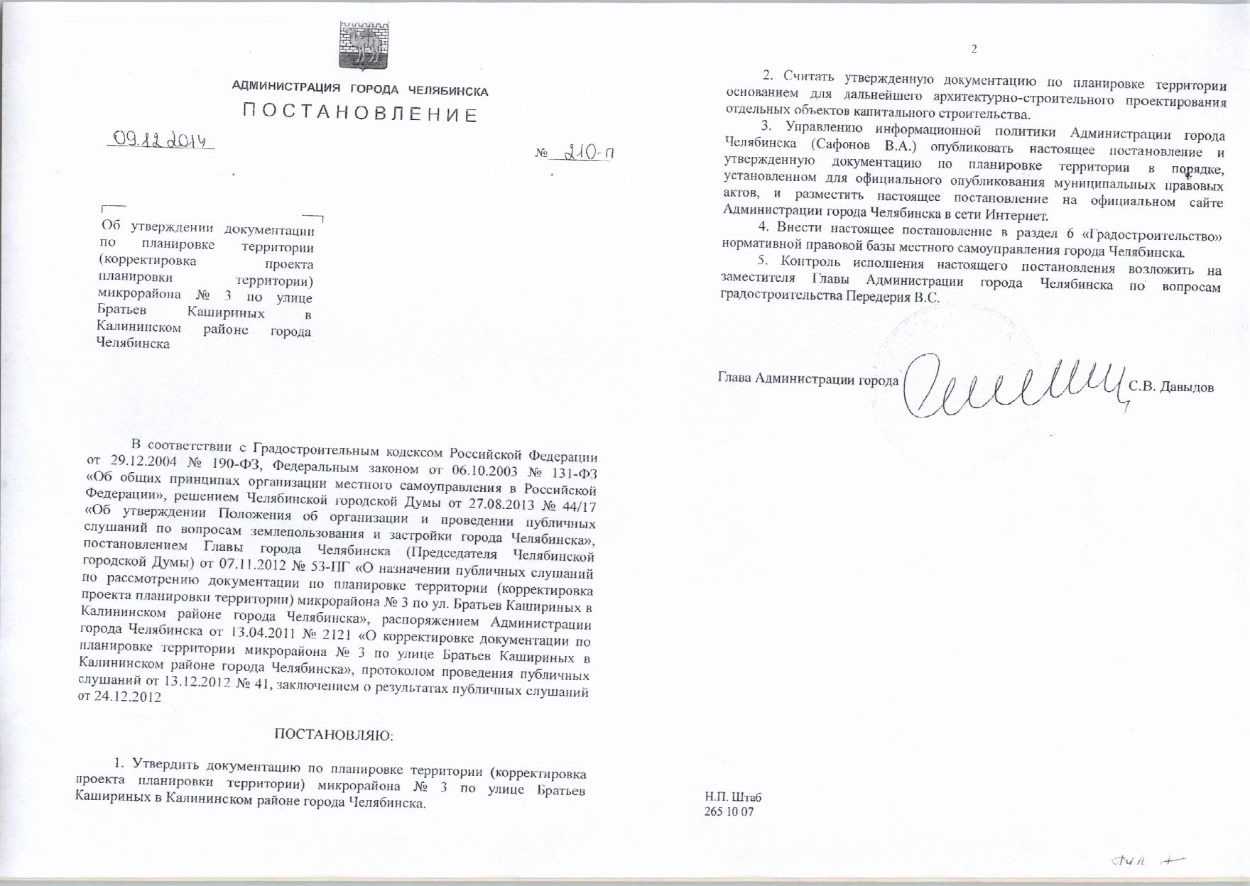 Постановление Главы города № 210-П от 09.12.2014 «Об утверждении документации по планировке территории микрорайона №3 по улице Братьев Кашириных в Калининском районе города Челябинска»
