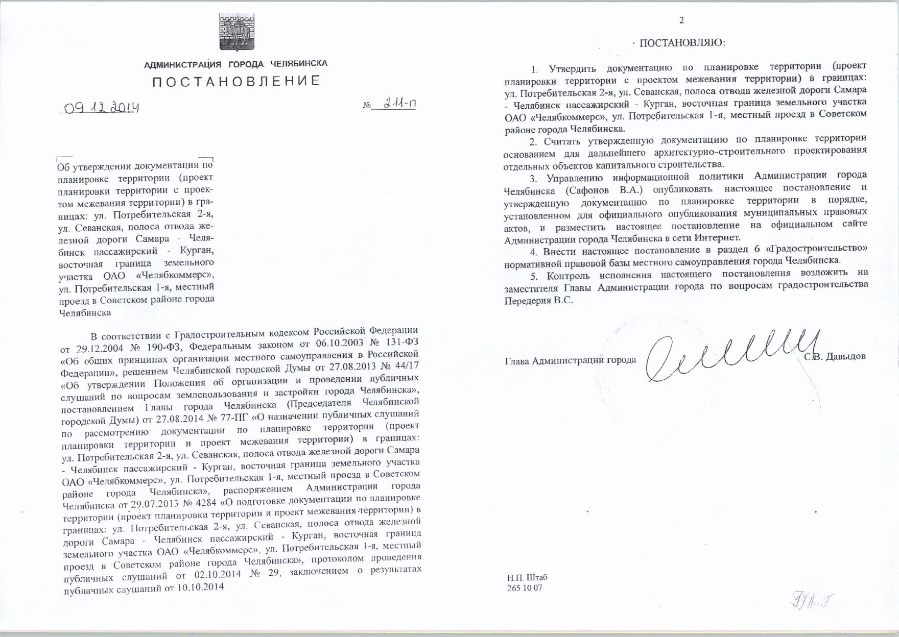 Постановление Главы города № 211-П от 09.12.2014 «Об утверждении документации по планировке территории в границах: ул. Потребительская 2-я, Севанская, полоса отвода железной дороги Самара - Челябинск пассажирский - Курган, восточная граница земельного участка ОАО "Челябкоммерс", Потребительская 1-я, местный проезд в Советском районе города Челябинска»