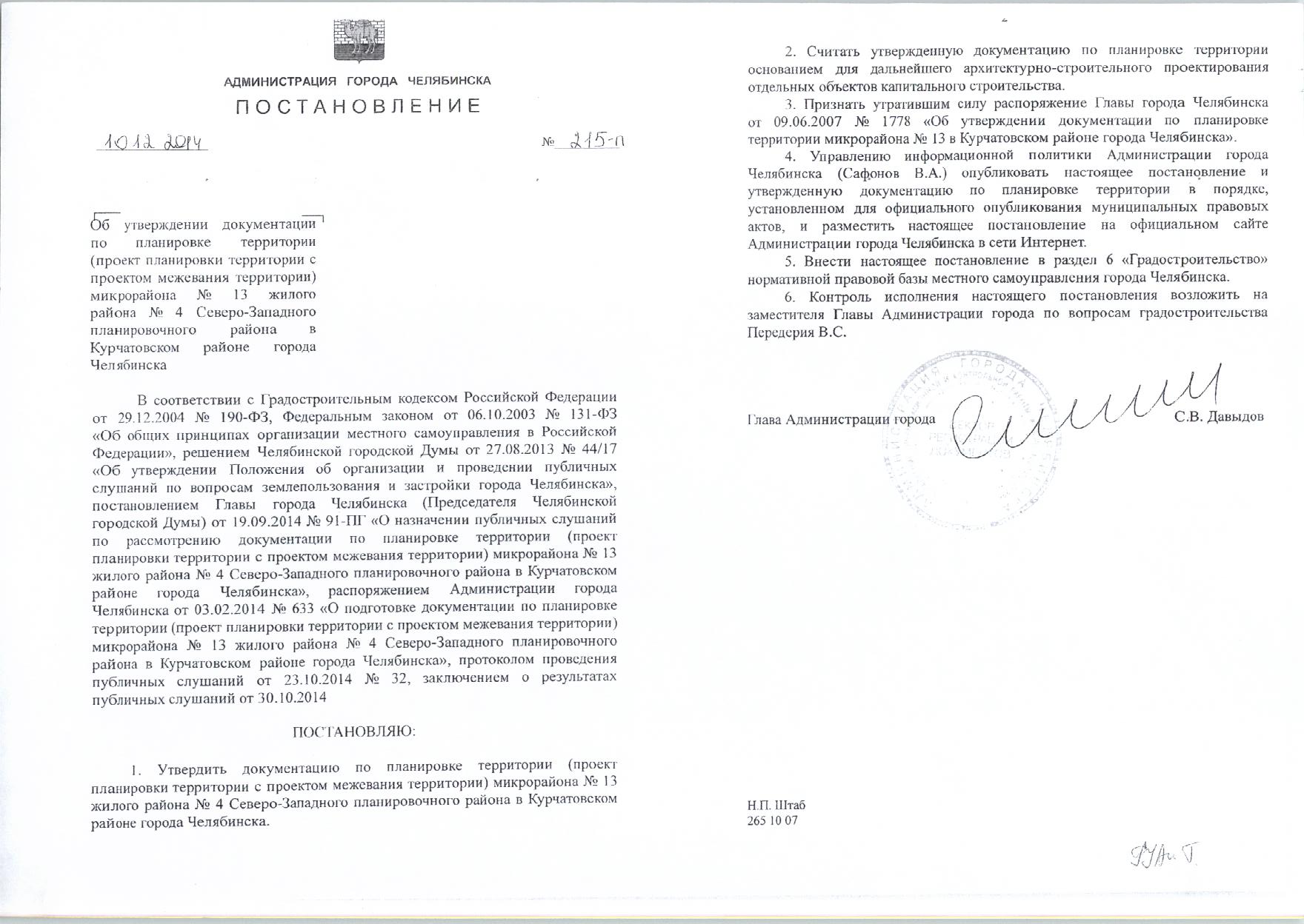 Постановление Главы города № 215-П от 10.12.2014 «Об утверждении документации по планировке территории микрорайона №13 жилого района №14 в Курчатовском районе города Челябинска»