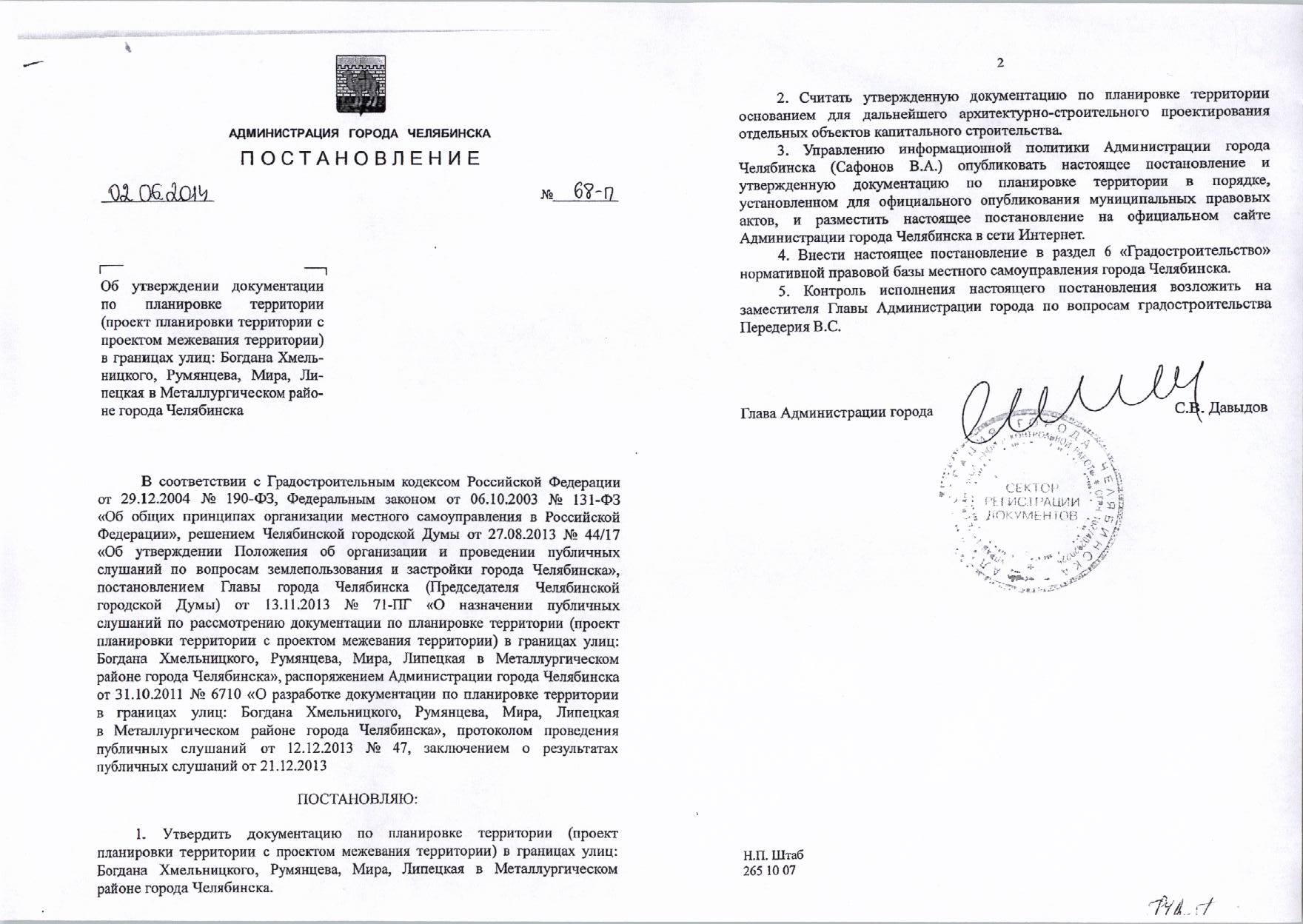 Постановление Главы города № 68-П от 02.06.2014 «Об утверждении документации по планировке территории в границах: ул.Богдана Хмельницкого, Румянцева, Мира, Липецкая в Металлургическом районе города Челябинска»