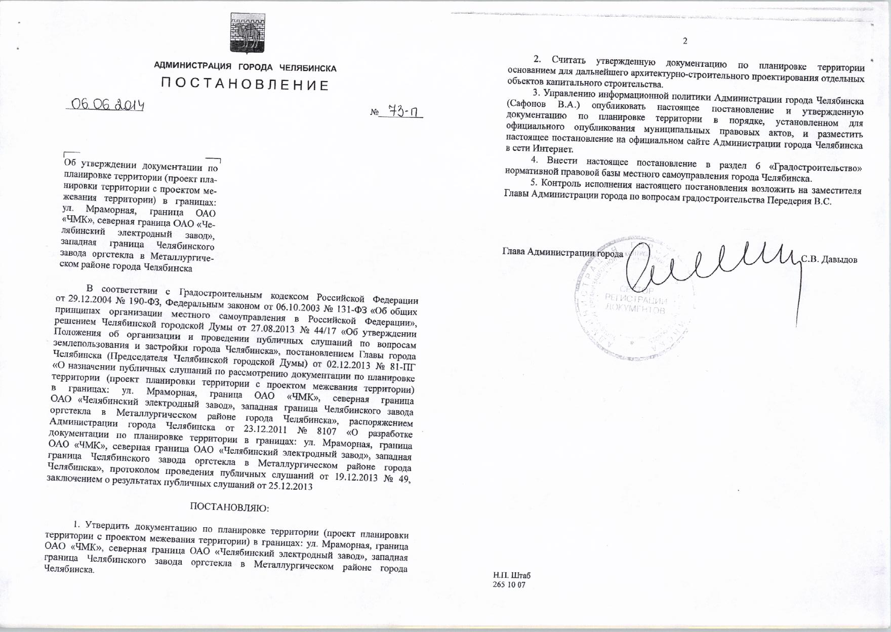 Постановление Главы города № 73-П от 06.06.2014 «Об утверждении документации по планировке территории в границах: ул.Мраморная, Граница ОАО "ЧМК", Северная граница ОАО "Челябинский электродный завод", Западная граница Челябинского завода оргстекла в Металлургическом районе города Челябинска»