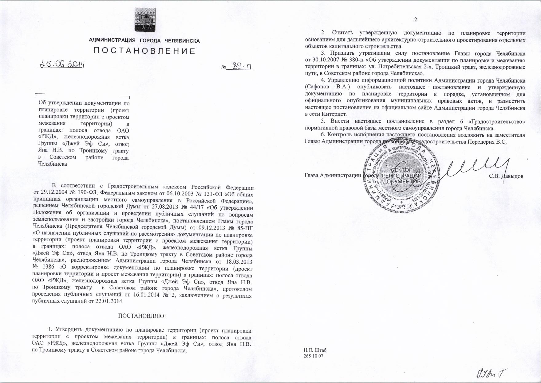 Постановление от 25.06.2014г №89-п «Об утверждении документации по планировке территории в границах: полоса отвода ОАО "РЖД", железнодорожная ветка Группы "Джей Эф Си", отвод Яна Н.В. по Троицкому тракту в Советском районе города Челябинска»