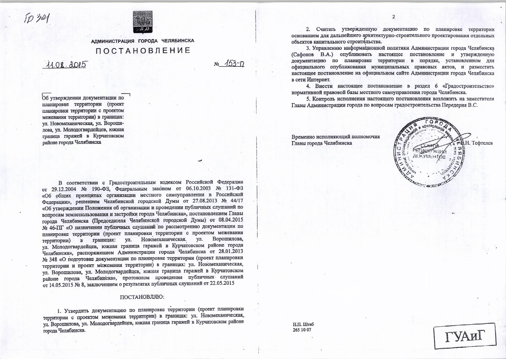 Постановление Главы города № 153-П от 11.08.2015 «Об утверждении документации по планировке территории в границах: ул. Новомеханическая, ул. Ворошилова, ул. Молодогвардейцев, южная граница гаражей в Курчатовском районе города Челябинска»