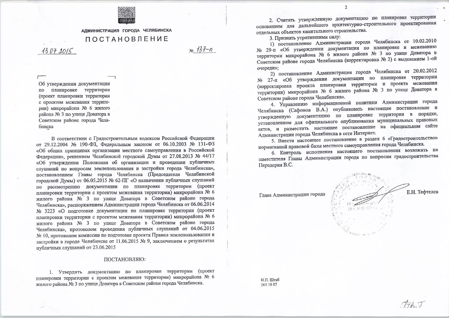 Постановление Главы города № 137-П от 13.07.2015 «Об утверждении документации по планировке территории микрорайона №6 жилого района №3 по улице Доватора в Советском районе районе города Челябинска»