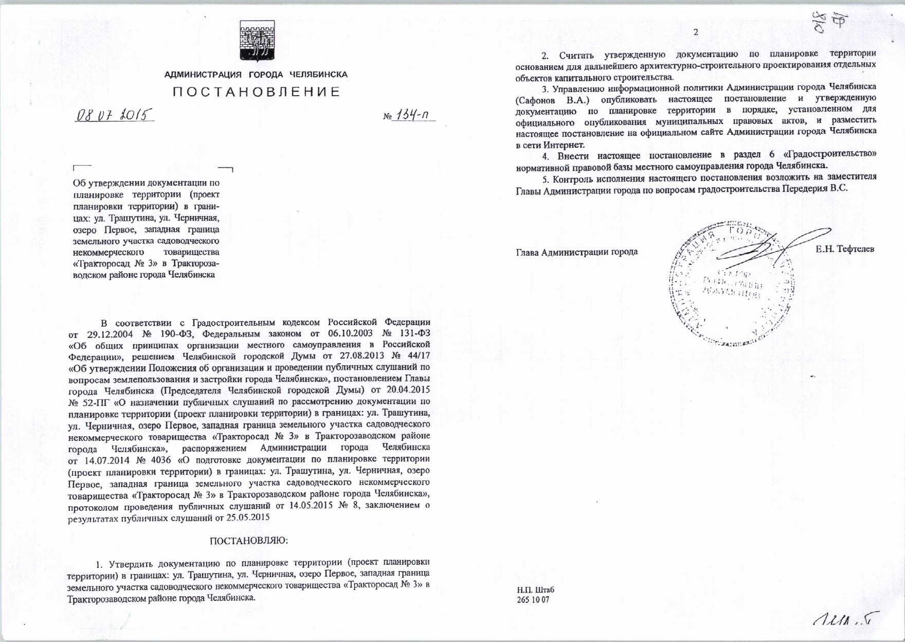 Постановление Главы города № 134-П от 08.07.2015 «Об утверждении документации по планировке территории в границах: ул. Трашутина, ул. Черничная, озеро Первое, западная граница садоводческого некоммерческого товарищества "Тракторосад №3" в Тракторозаводском районе города Челябинска»