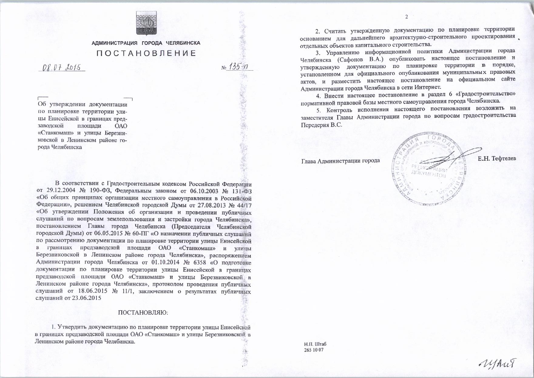 Постановление Главы города № 135-П от 08.07.2015 «Об утверждении документации по планировке территории улицы Енисейской в границах предзаводской площади ОАО "Станкомаш" и улицы Березниковской в Ленинском районе города Челябинска»