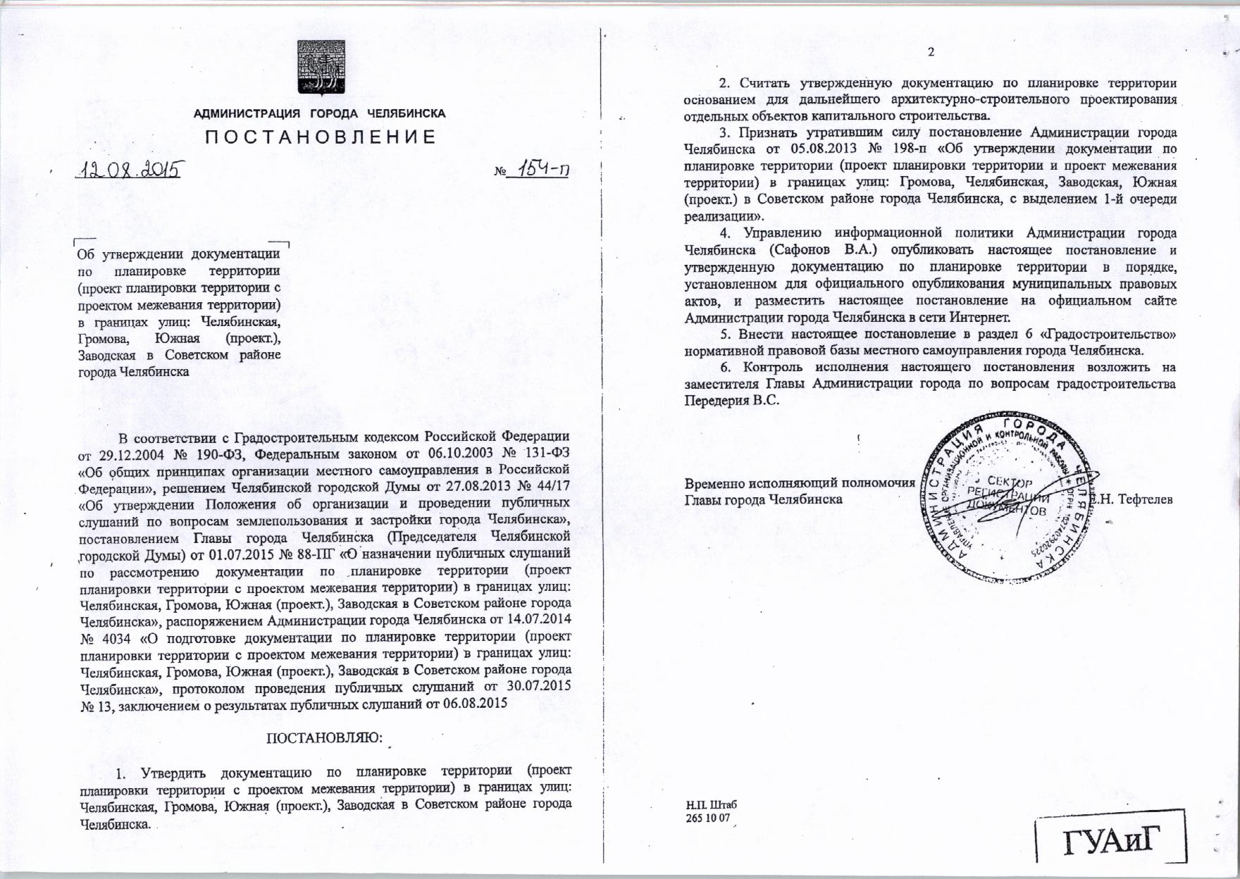 Постановление Главы города № 154-П от 12.08.2015 «Об утверждении документации по планировке территории в границах улиц: Челябинская, Громова, Южная (проект.), Заводская в Советском районе районе города Челябинска»