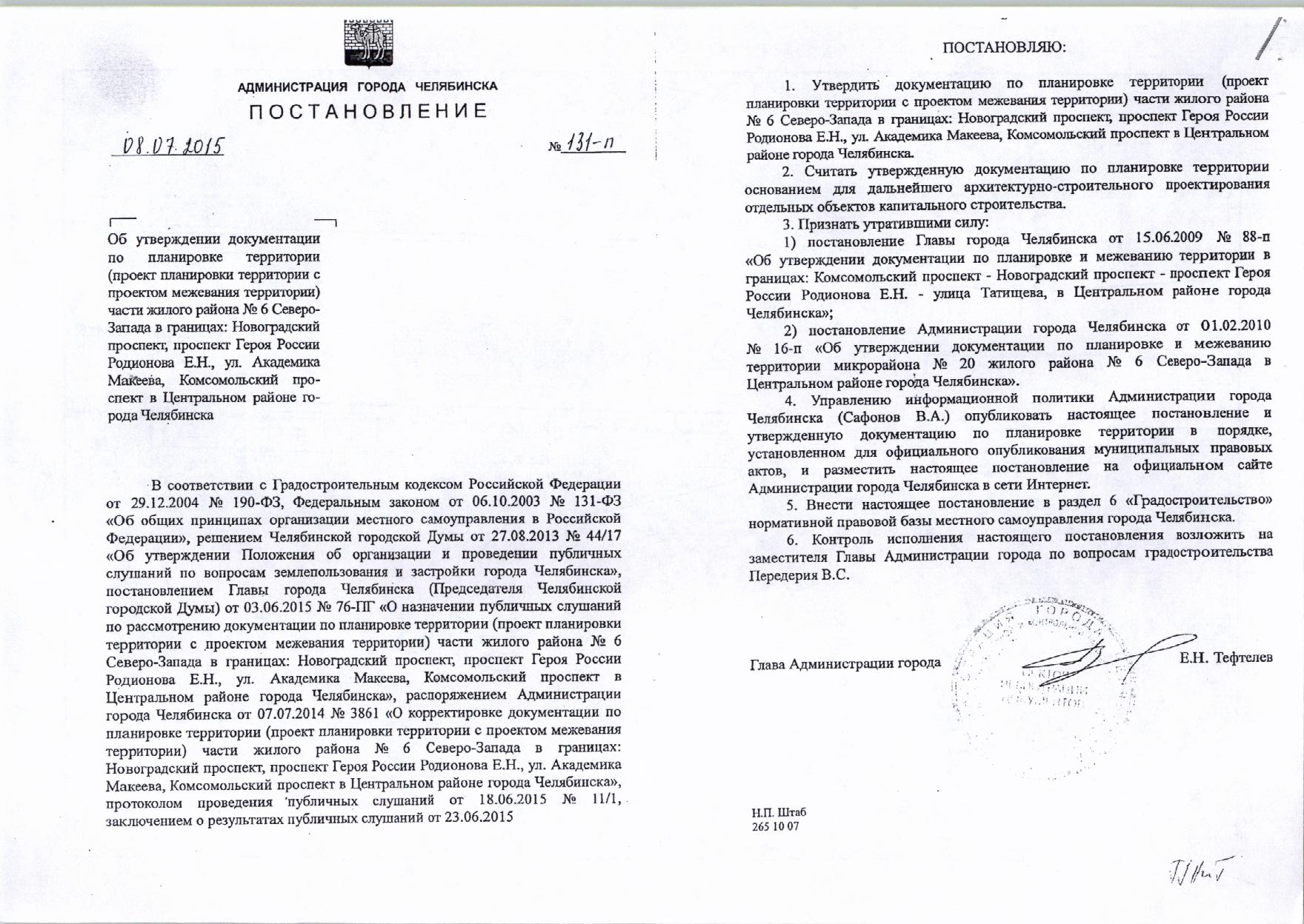 Постановление Главы города № 131-П от 08.07.2015 «Об утверждении документации по планировке территории части жилого района №6 Северо-Запада в границах: Новоградский проспект, проспект Героя России Родионова Е.Н., ул. Академика Макеева, Комсомольский проспект в Центральном районе города Челябинска»