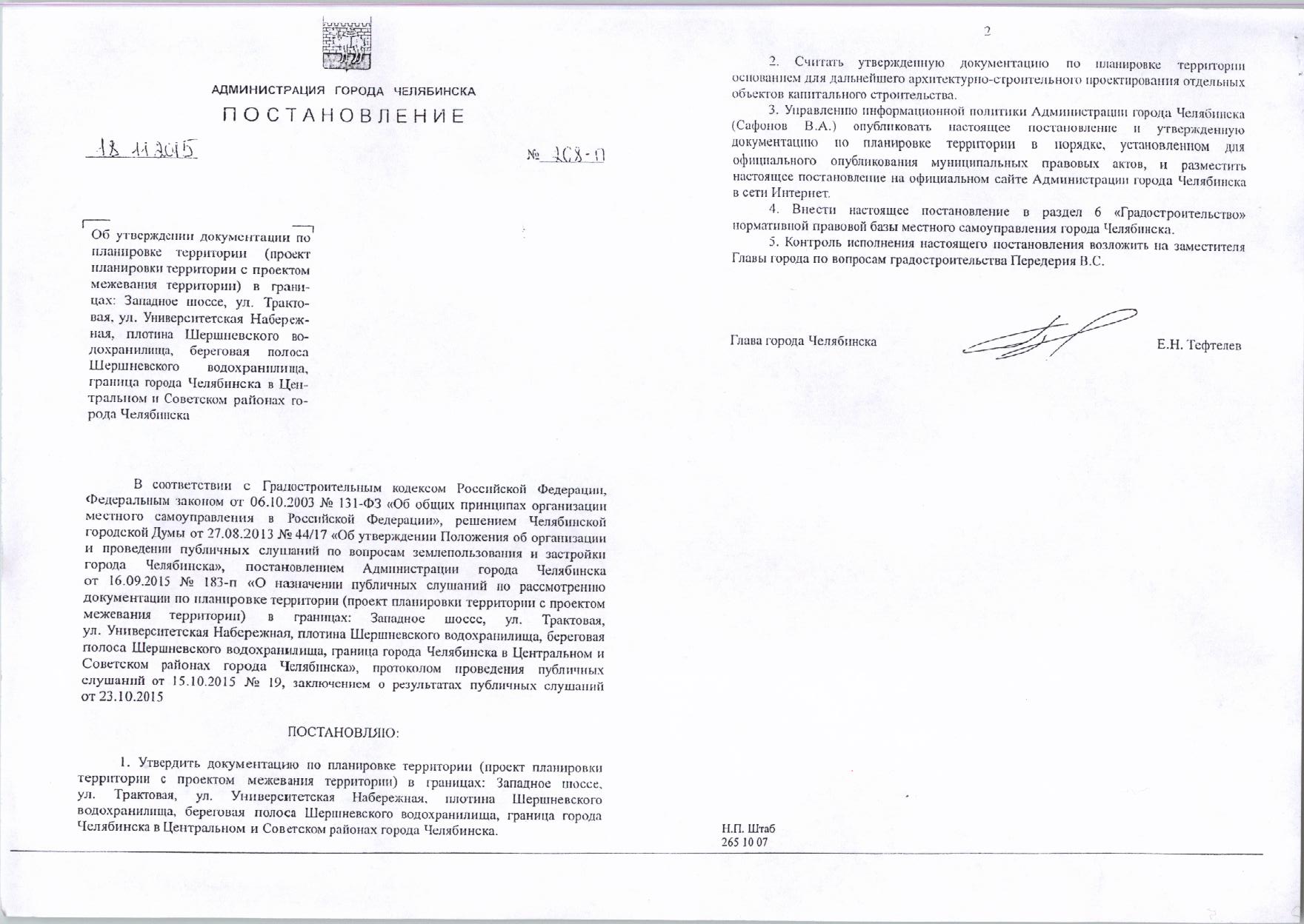 Постановление Главы города № 268-П от 18.11.2015 «Об утверждении документации по планировке территории (проект планировки территории с проектом межевания территории) в границах: Западное шоссе, ул. Трактовая, ул. Университетская Набережная, плотина Шершневского водохранилища, береговая полоса Шершневского водохранилища, граница города Челябинска в Центральном и Советском районах города Челябинска»