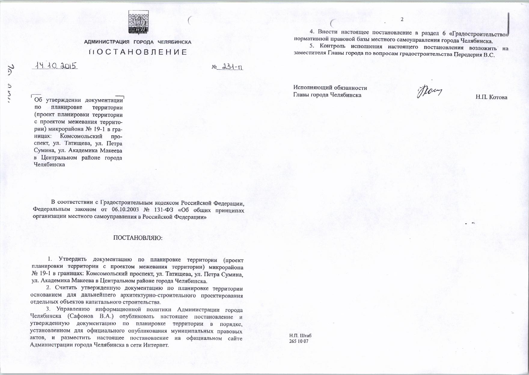 Постановление Главы города № 231-П от 14.10.2015 «Об утверждении документации по планировке территории микрорайона №19-1 в границах: Комсомольский проспект, ул. Татищева, ул. Петра Сумина, ул. Академика Макеева в Центральном районе города Челябинска»