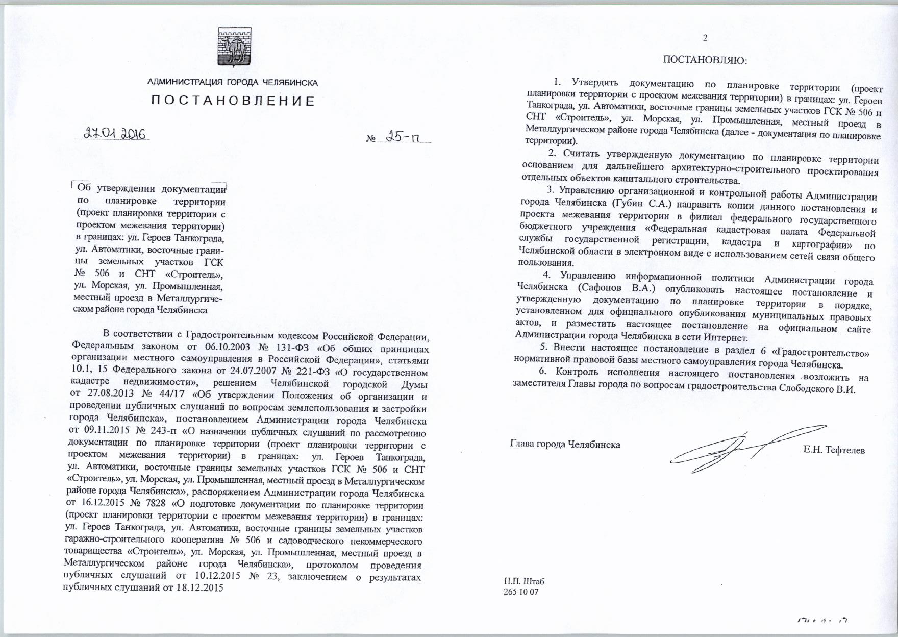Постановление Главы города № 25-П от 27.01.2016 «Об утверждении документации по планировке территории в границах: ул. Героев Танкограда, ул. Автоматики, восточные границы земельных участков ГСК №506 и СНТ "Строитель", ул. Морская, ул. Промышленная, местный проезд в Металлургическом районе города Челябинска»