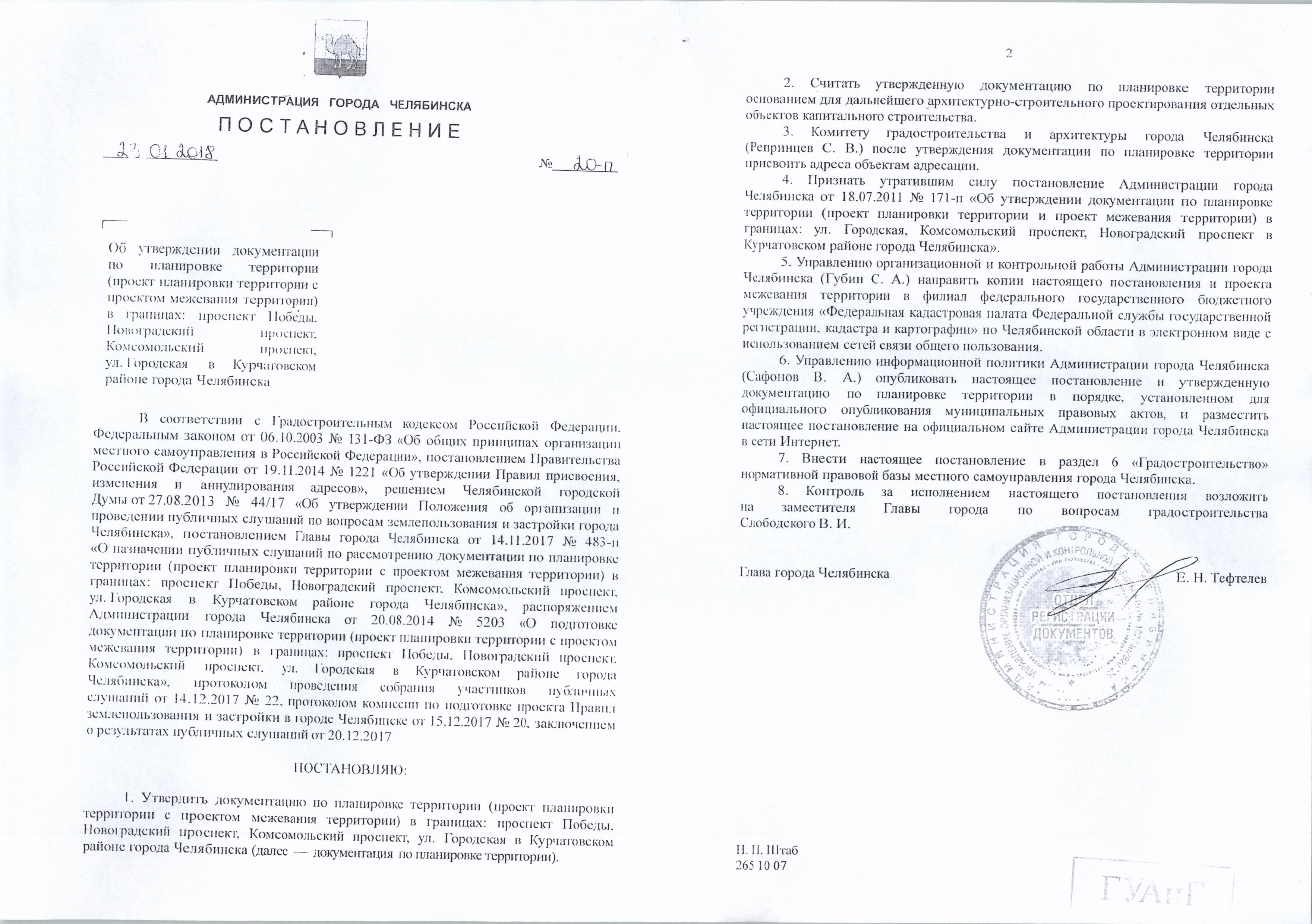 Постановление Главы города № 20-П от 23.01.2018 "Об утверждении документации по планировке территории (проект планировки территории с проектом межевания территории) в границах: проспект Победы, Новоградский проспект, Комсомольский проспект, ул. Городская в Курчатовском районе города Челябинска"