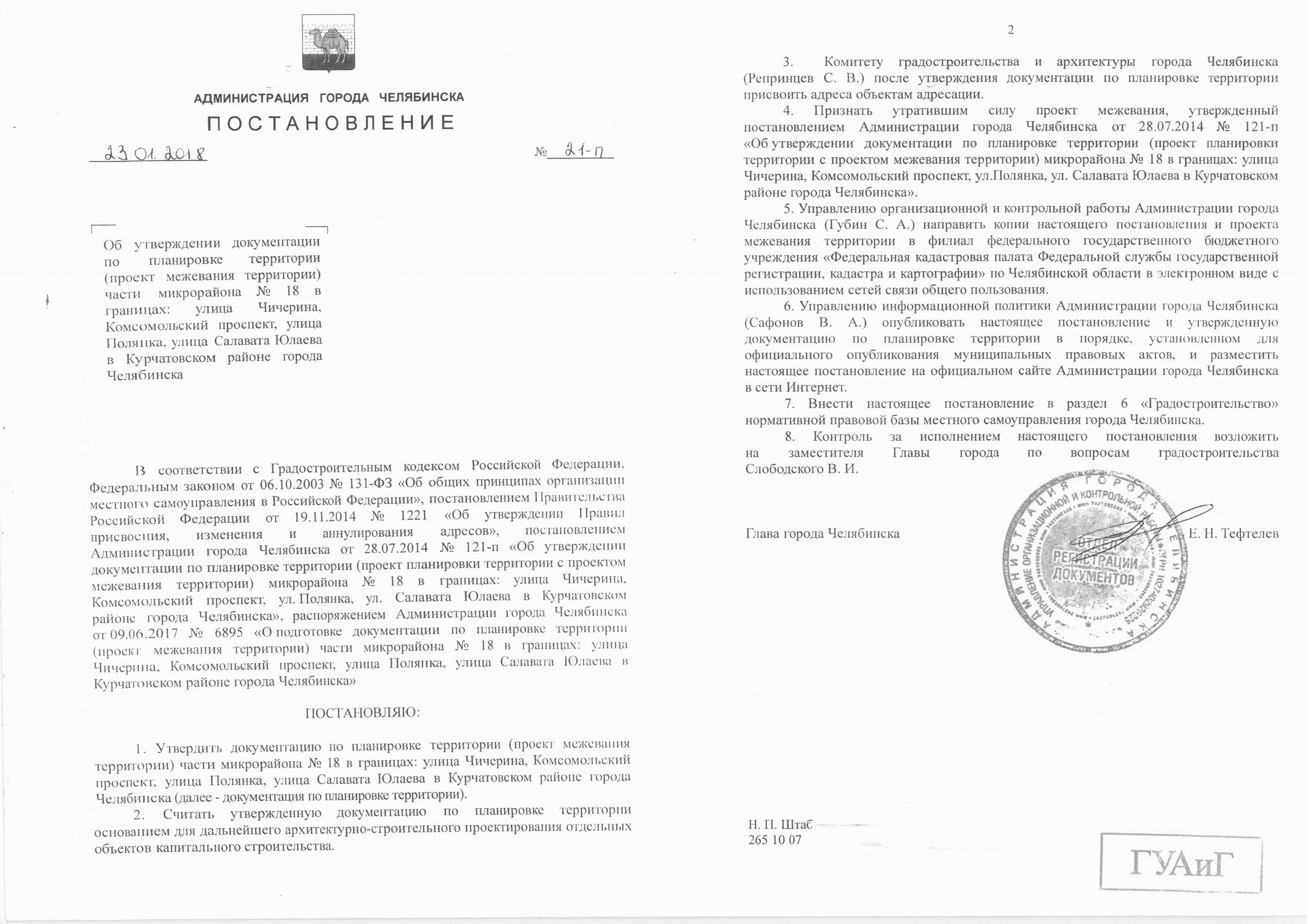 Постановление Главы города № 21-П от 23.01.2018 "Об утверждении документации по планировке территории (проект межевания территории) части микрорайона № 18 в границах: улица Чичерина, Комсомольский проспект, улица Полянка, улица Салавата Юлаева в Курчатовском районе города Челябинска"