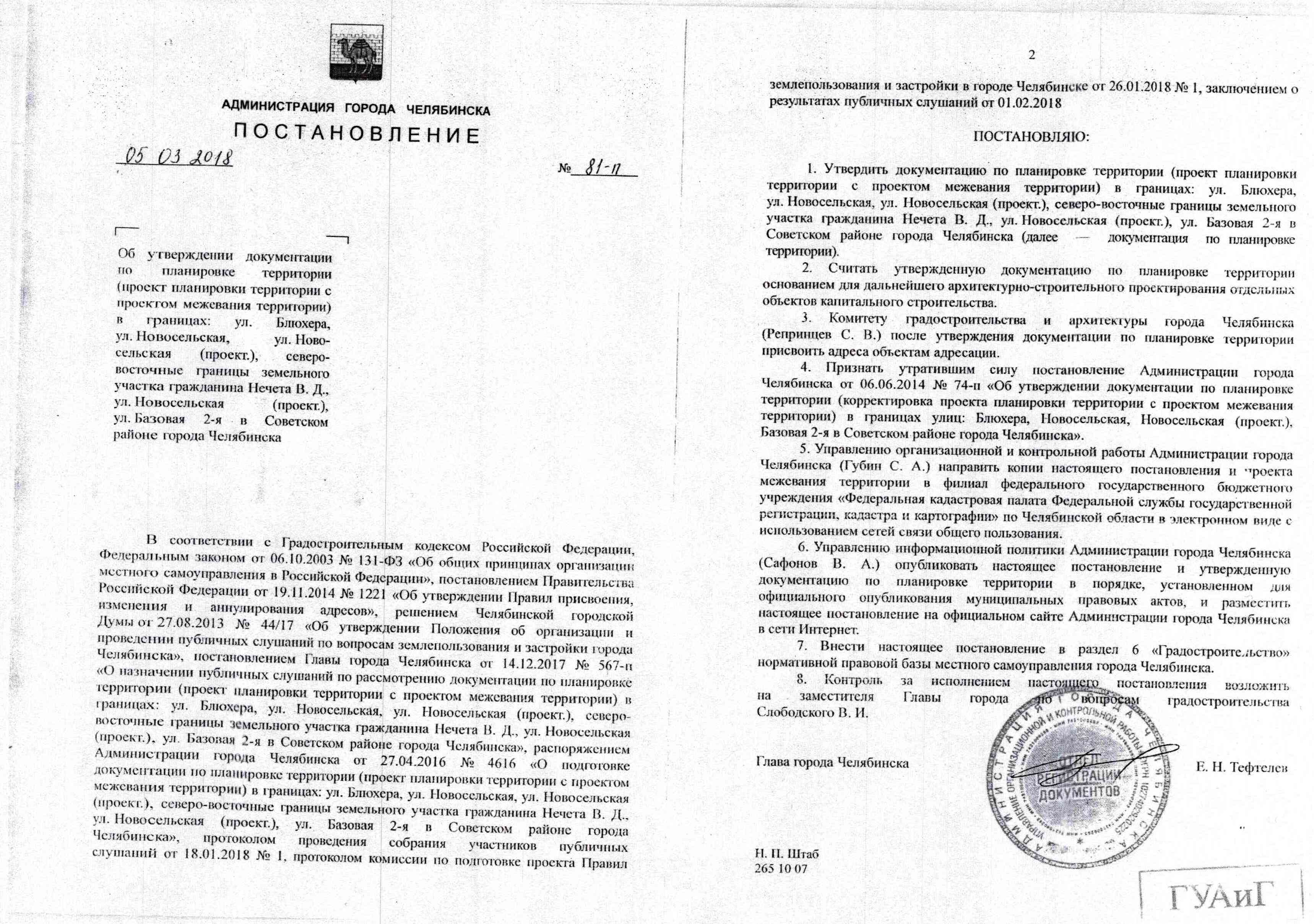 Постановление Главы города № 81-П от 05.03.2018 "Об утверждении документации по планировке территории (проект планировки территории с проектом межевания территории) в границах: ул. Блюхера, ул. Новосельская, ул. Новосельская (проект.), северо-восточные границы земельного участка гражданина Нечета В. Д., ул. Новосельская (проект.), ул. Базовая 2-я в Советском районе города Челябинска"