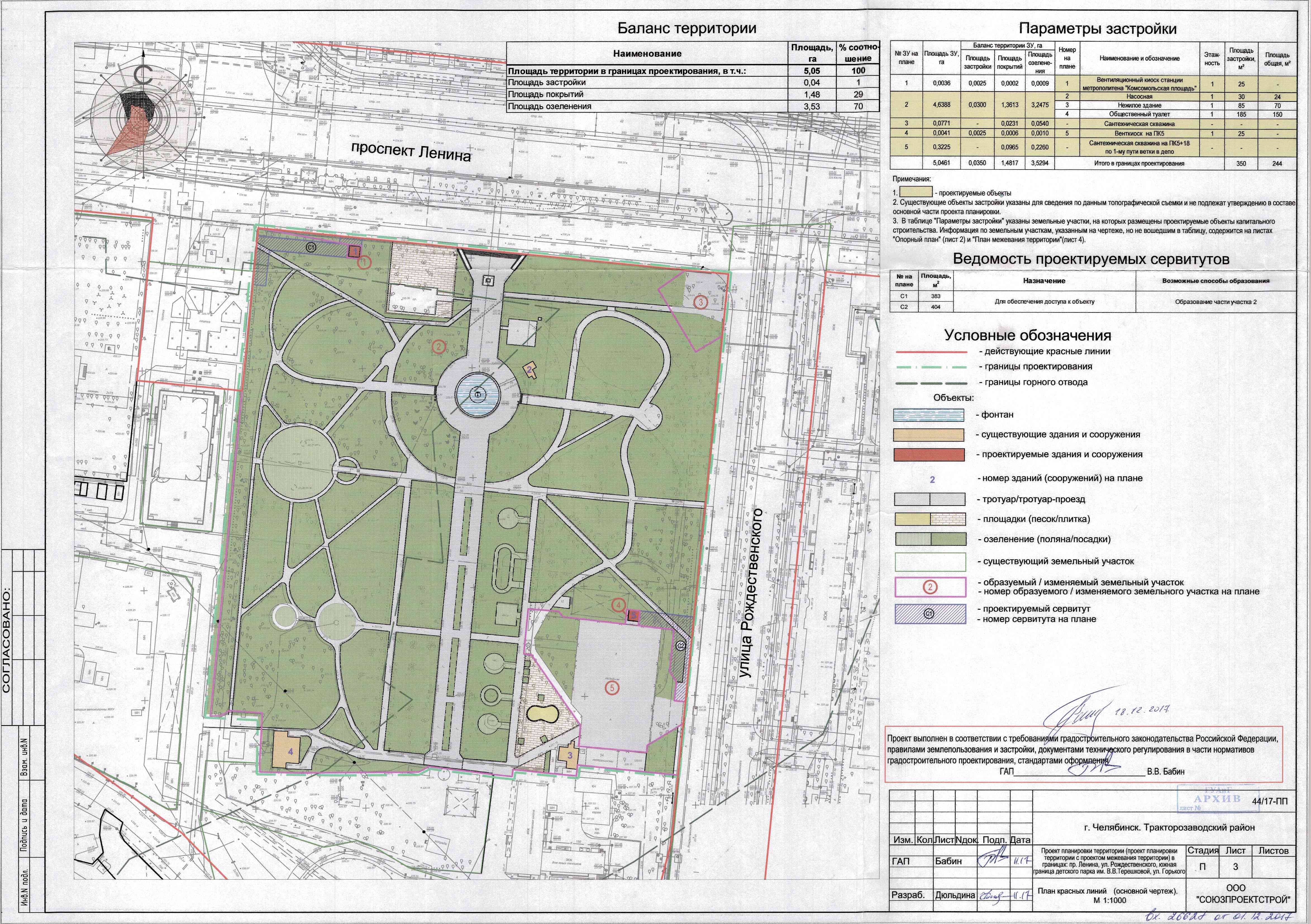 Документация по планировке территории (проект планировки территории с проектом межевания территории) в границах: пр. Ленина, ул. Рождественского, южная граница детского парка им. В. В. Терешковой, ул. Горького в Тракторозаводском районе города Челябинска ч.1 (основной чертеж)