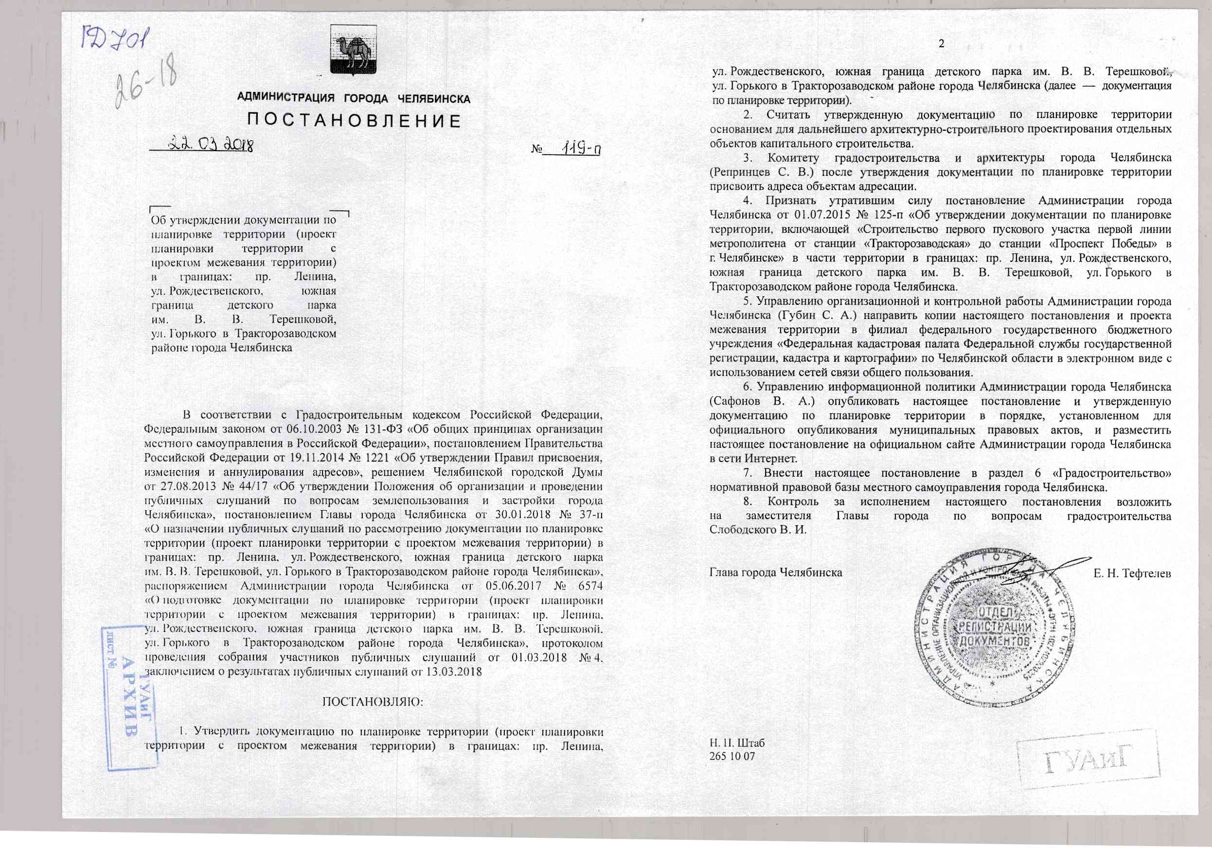Постановление Главы города № 119-П от 22.03.2018 "Об утверждении документации по планировке территории (проект планировки территории с проектом межевания территории) в границах: пр. Ленина, ул. Рождественского, южная граница детского парка им. В. В. Терешковой, ул. Горького в Тракторозаводском районе города Челябинска"