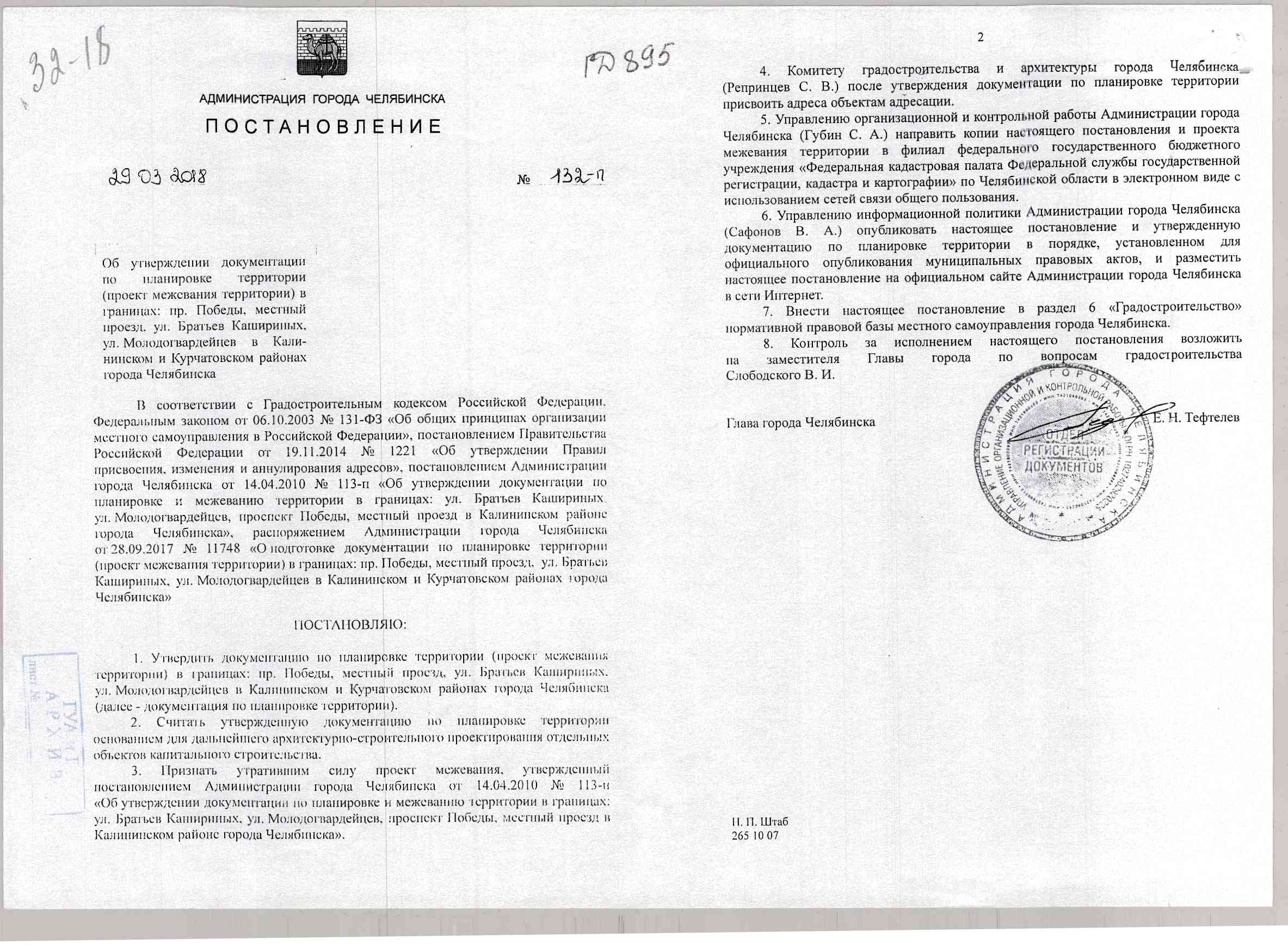 Постановление Главы города № 132-П от 29.03.2018 "Об утверждении документации по планировке территории (проект межевания территории) в границах: пр. Победы, местный проезд, ул. Братьев Кашириных, ул. Молодогвардейвец в Калининском и Курчатовском районах города Челябинска"