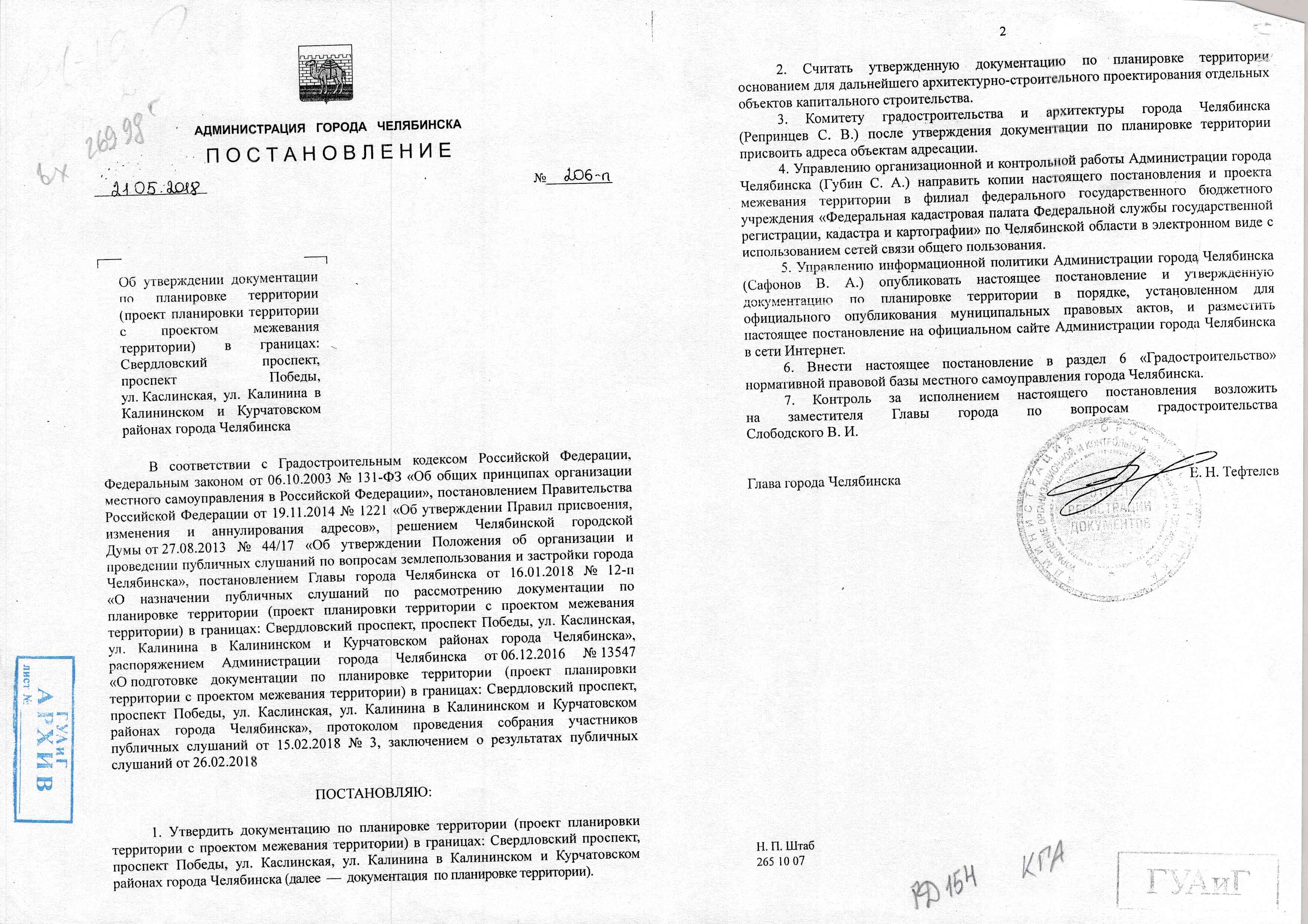 Постановление Главы города № 206-П от 21.05.2018 "Об утверждении документации по планировке территории (проект планировки территории с проектом межевания территории) в границах: Свердловский проспект, проспект Победы, ул. Каслинская, ул. Калинина в Калининском и Курчатовском районах города Челябинска"