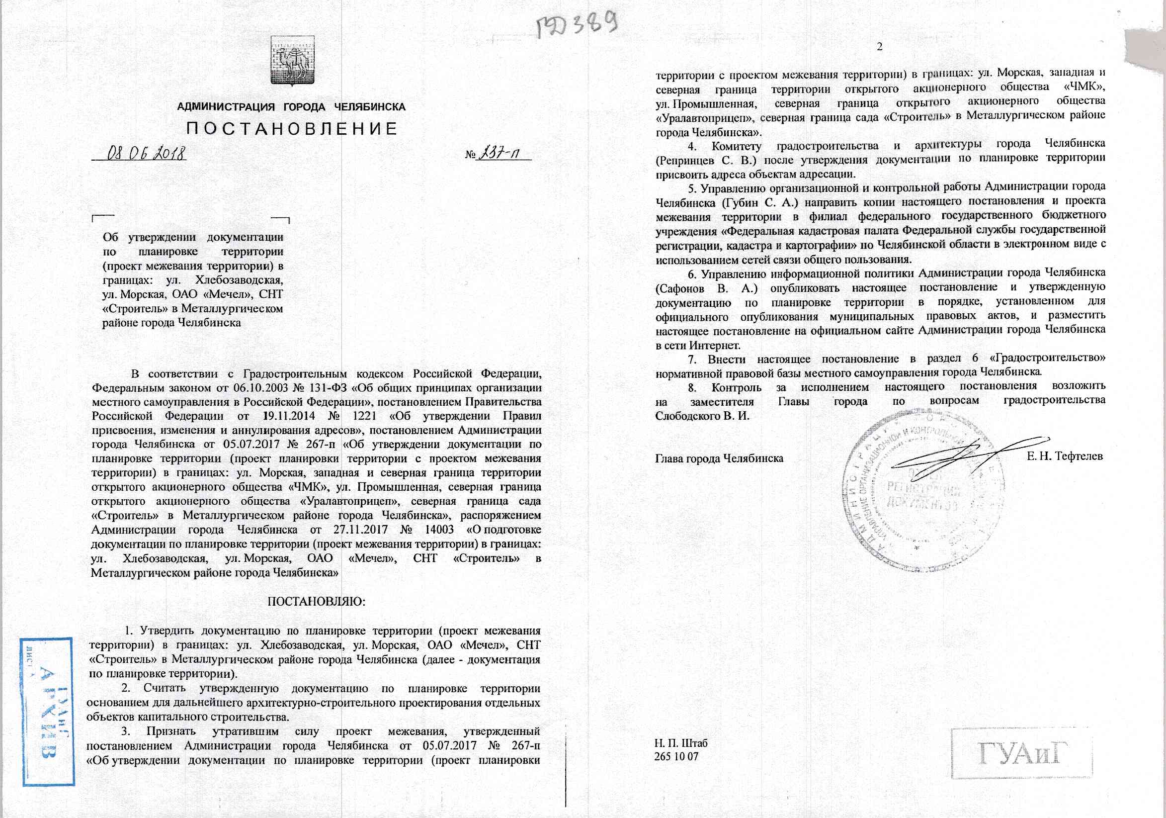 Постановление Главы города № 237-П от 08.06.2018 "Об утверждении документации по планировке территории (проект планировки территории с проектом межевания территории) в границах: ул. Хлебозаводская, ул. Морская, ОАО "Мечел", СНТ "Строитель" в Металлургическом районе города Челябинска"