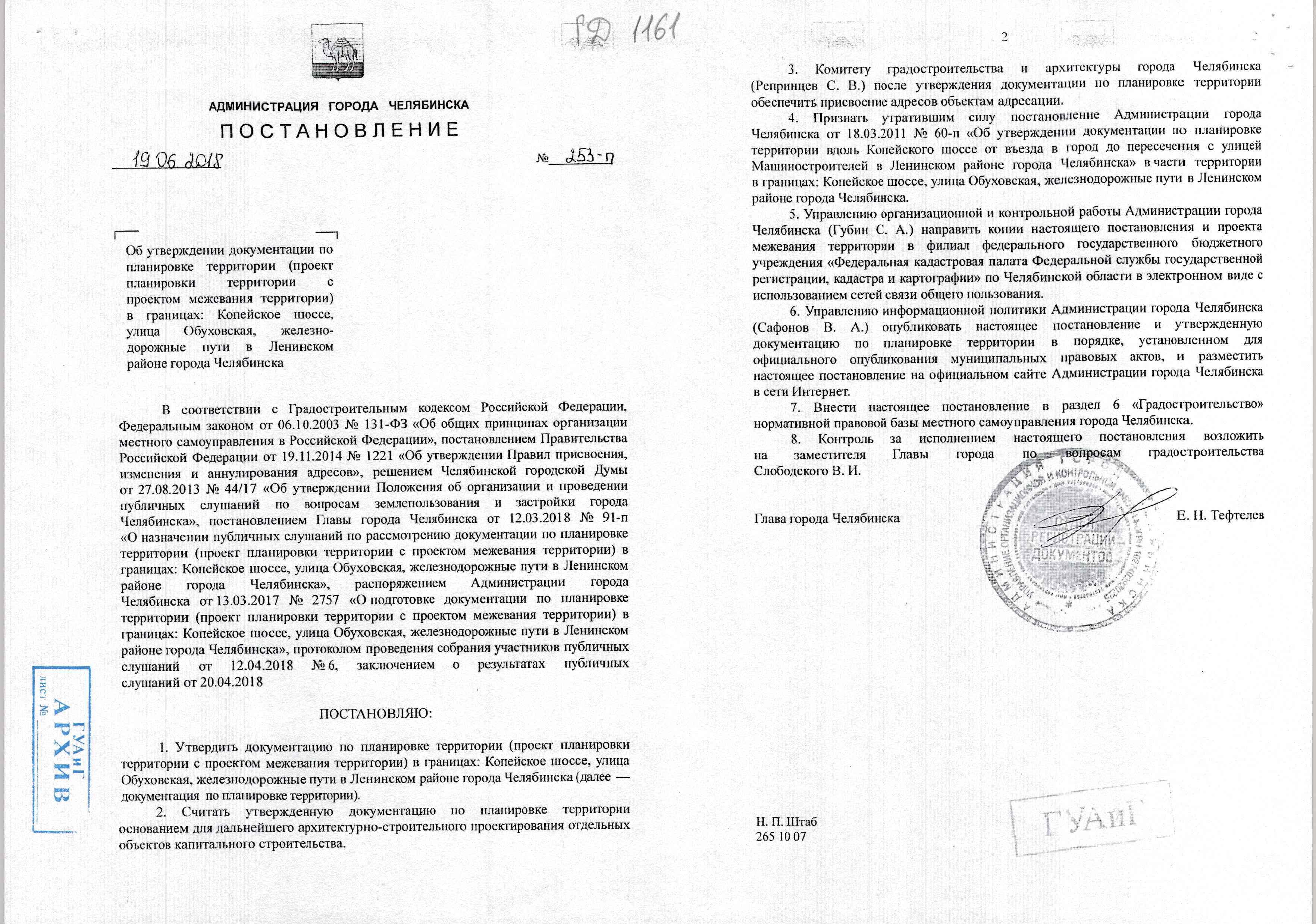 Постановление Главы города № 253-П от 19.06.2018 "Об утверждении документации по планировке территории (проект планировки территории с проектом межевания территории) в границах: Копейское Шоссе, улица Обуховская, железно-дорожные пути в Ленинском районе города Челябинска"