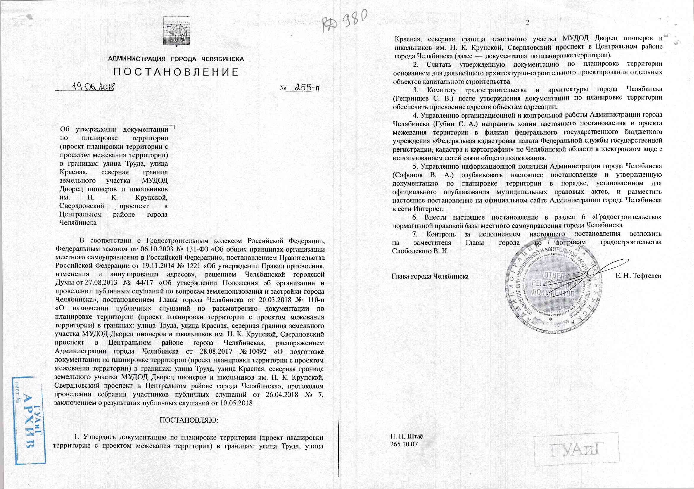 Постановление Главы города № 255-П от 19.06.2018 "Об утверждении документации по планировке территории (проект планировки территории с проектом межевания территории) в границах: улица Труда, улица Красная, северная граница земельного участка МУДОД Дворец пионеров и школьников им. Н. К. Крупской, свердловский проспект в Центральном районе города Челябинска"