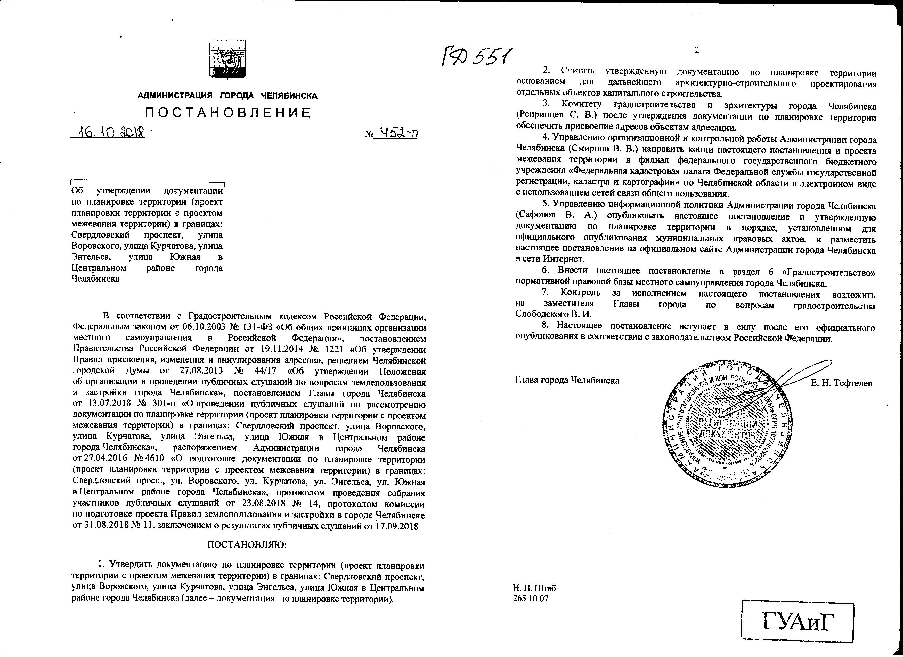 Постановление Главы города № 452-П от 16.10.2018 "Об утверждении документации по планировке территории (проект планировки территории с проектом межевания территории) в границах: Свердловский проект, улица Воровского, улица Курчатова, улица Энгельса, улица Южная в Центральном районе города Челябинска"