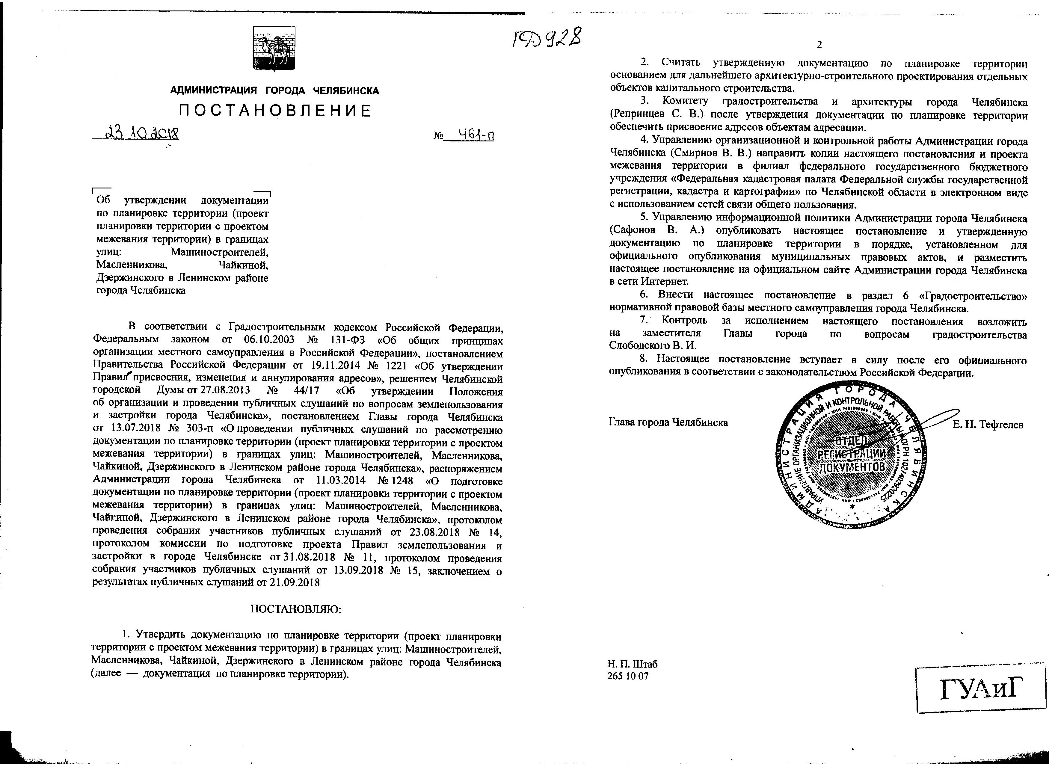 Постановление Главы города № 461-П от 23.10.2018 "Об утверждении документации по планировке территории (проект планировки территории с проектом межевания территории) в границах улиц: Машиностроителей, Масленникова, Чайкиной, Дзержинского в Ленинском районе города Челябинска"