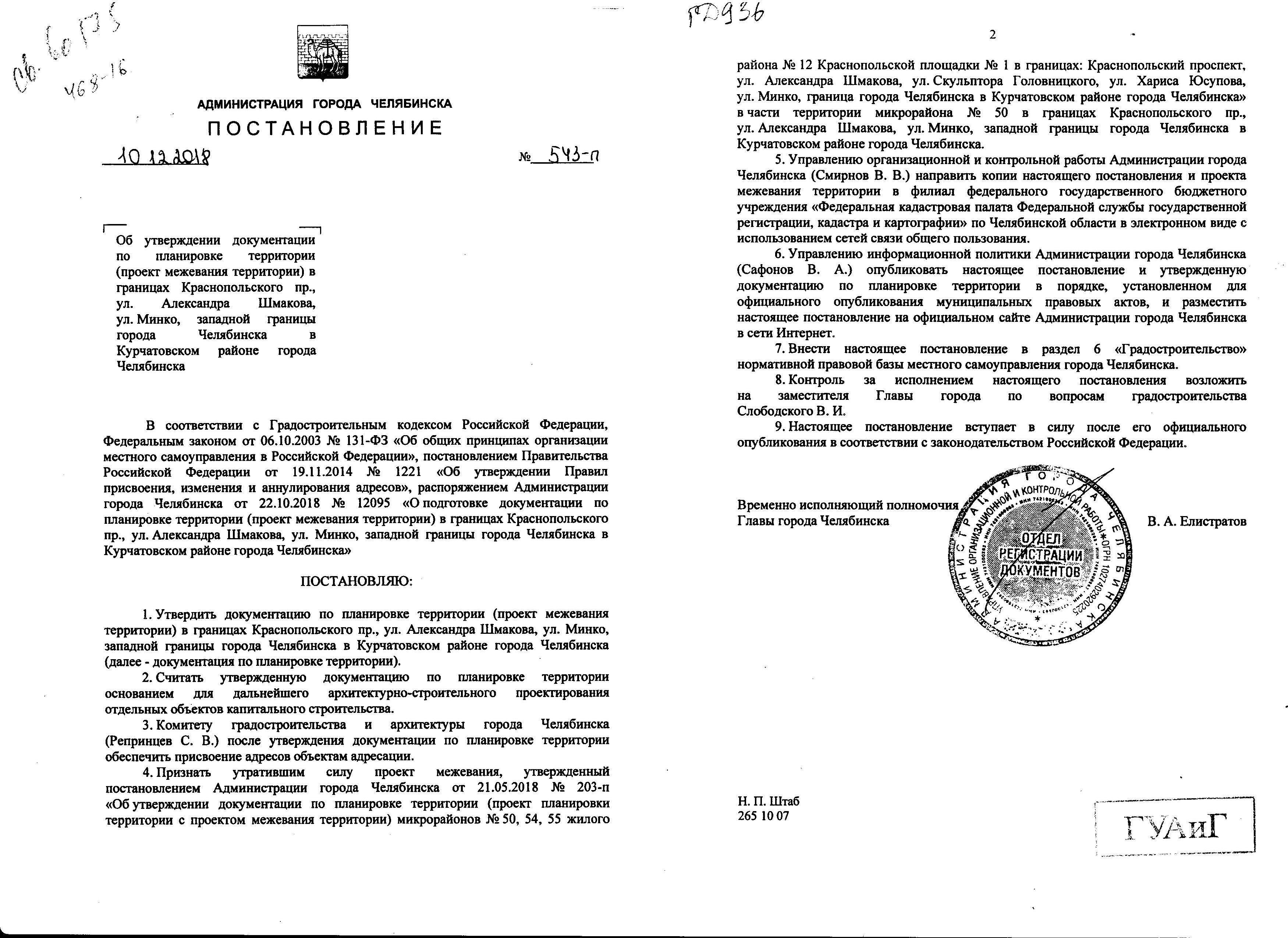 Постановление Главы города № 543-П от 10.12.2018 "Об утверждении документации по планировке территории (проект межевания территории) в границах Краснопольского пр., ул. Александра Шмакова, ул. Минко, западной границы города Челябинска в Курчатовском районе города Челябинска"