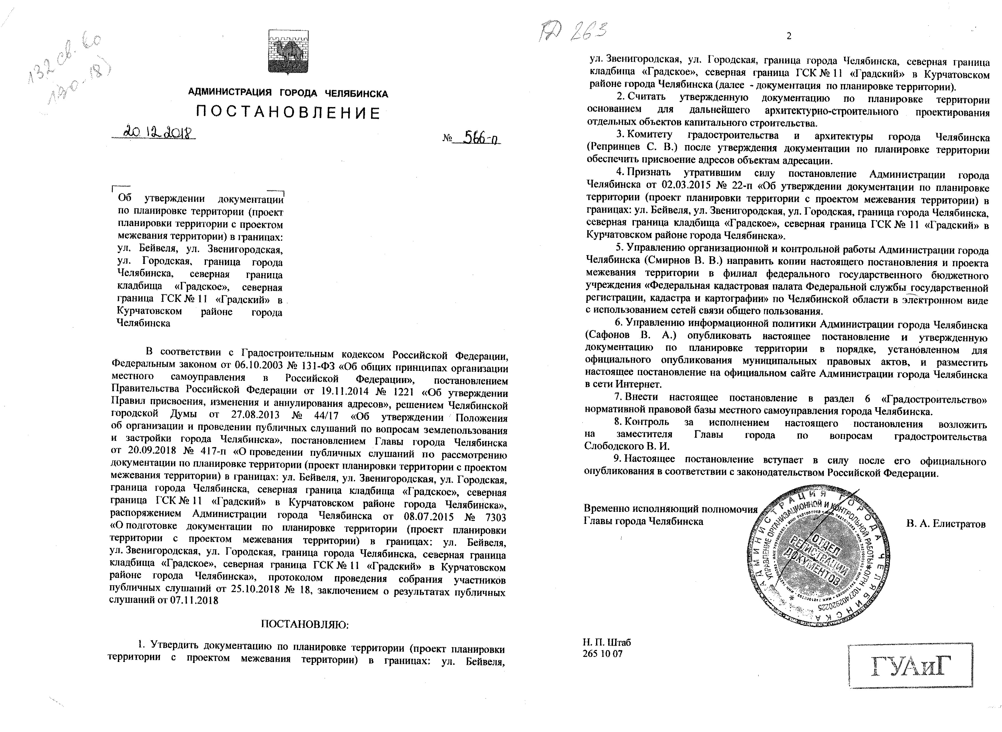 Постановление Главы города № 566-П от 20.12.2018 "Об утверждении документации по планировке территории (проект планировки территории с проектом межевания территории) в границах: ул. Бейвеля, ул. Звенигордская, ул. Городская, граница города Челябинска, северная граница кладбища "Градское", северная граница ГСК №11 "Градский" в Курчатовском районе города Челябинска"
